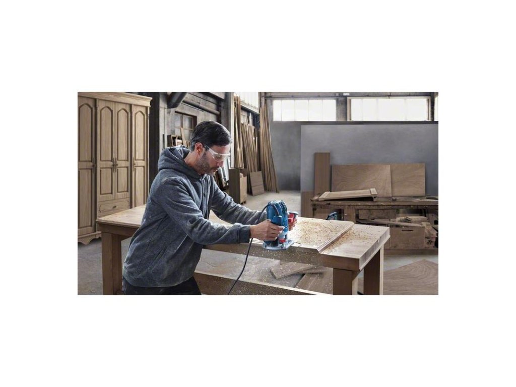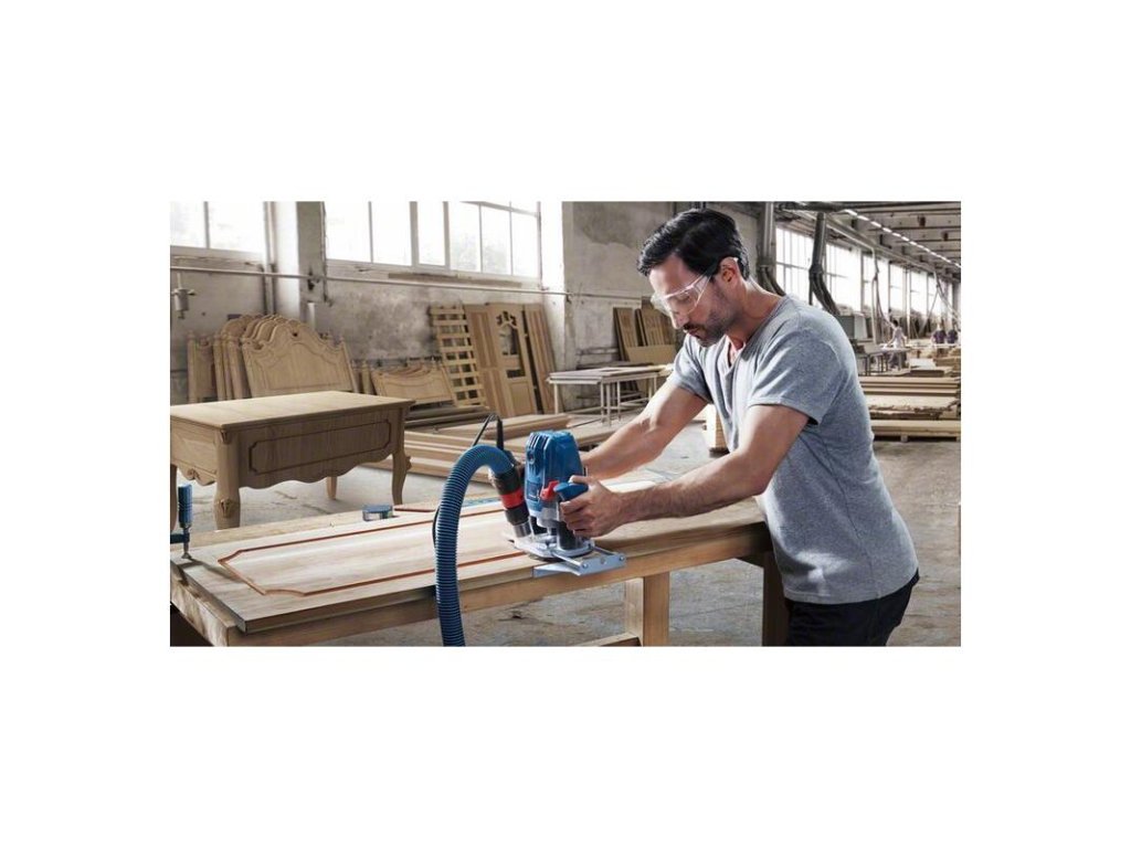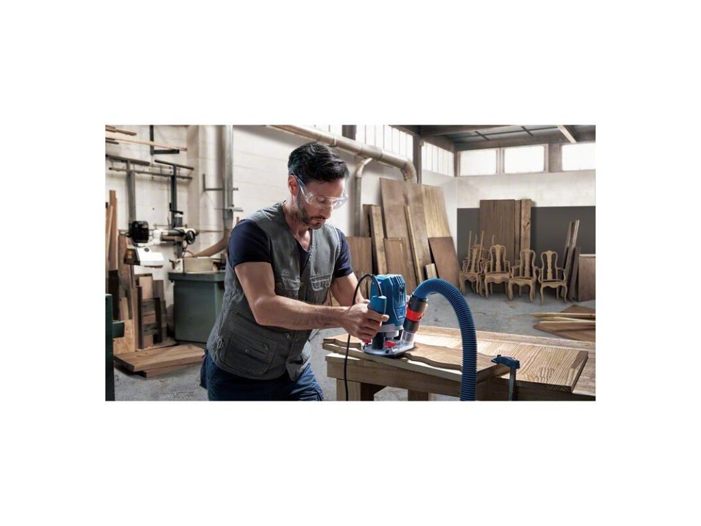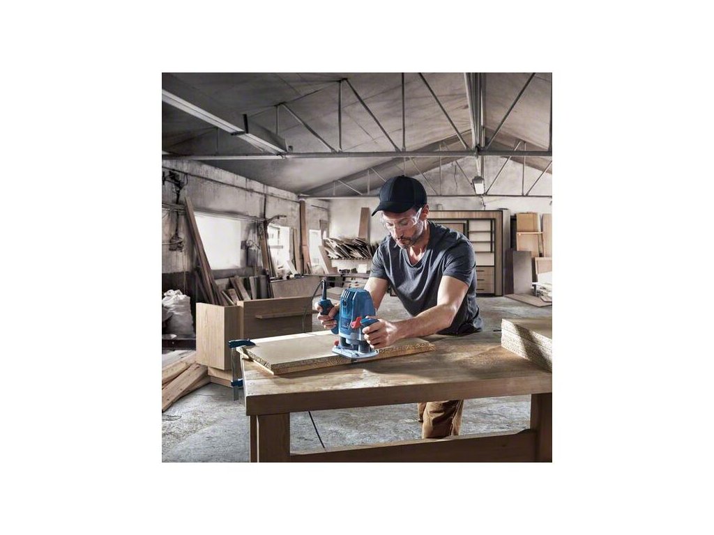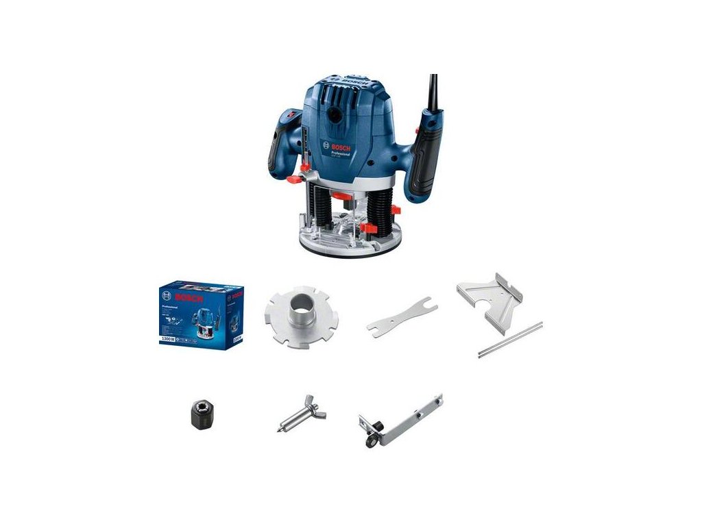 Horná fréza GOF 130, Vynikajúce novinky pre všetkých pracujúcich s drevom – fréza Bosch GOF 130 Professional ponúka vyššiu efektivitu pri akomkoľvek frézovaní vďaka funkcii konštantných otáčok Constant Speed a vynikajúcemu výkonu motora. Rýchle frézovanie do tvrdého dreva, mäkkého dreva, MDF alebo preglejky. Funkcia konštantných otáčok Constant Speed umožňuje prácu bez prerušení a zasekávania a poskytuje maximálnu efektivitu frézovania vo svojej triede. Inovatívna ponorná konštrukcia minimalizuje nasávanie prachu a zabraňuje uviaznutiu pri otáčkach viac než 10 000 za minútu, a to najmä v prašnom a náročnom prostredí. A v neposlednom rade ponúka flexibilné možnosti výmeny frézovacích hrotov, a to manuálne použitím kľúčov alebo zámkom vretena. Kľúč (katalógové číslo 1.600.A02.28G); Paralelný doraz (katalógové číslo 1.619.PB5.511); Kopírovacia objímka (katalógové číslo 1.619.PB5.522); Odsávací adaptér (katalógové číslo 1.619.PB5.521); Vystreďovací kolík (katalógové číslo 1.619.PB5.523); Vodiaci valec (katalógové číslo 1.619.PB5.515); Upínacia klieština 8 mm (katalógové číslo 1.619.PB5.490); Upínacia klieština 6 mm (katalógové číslo 1.619.PB5.492)