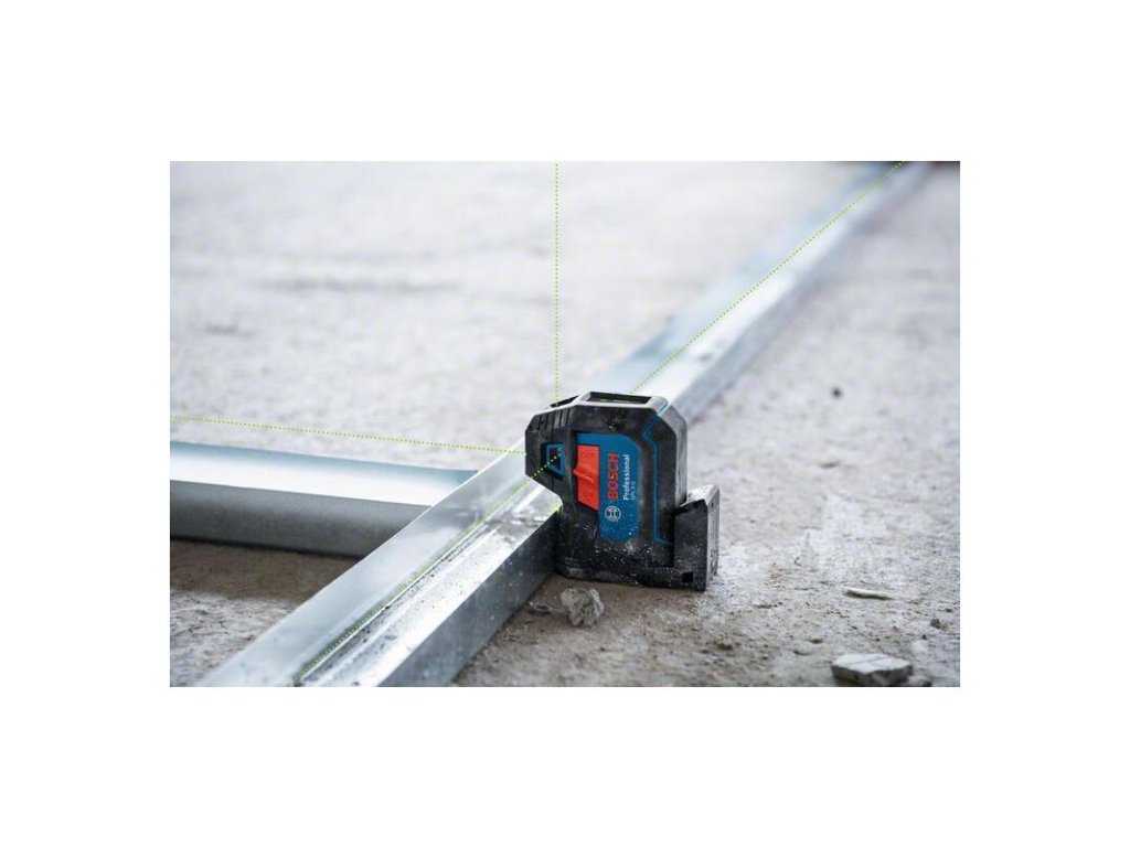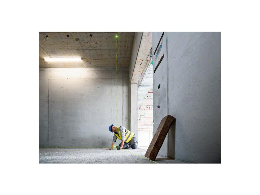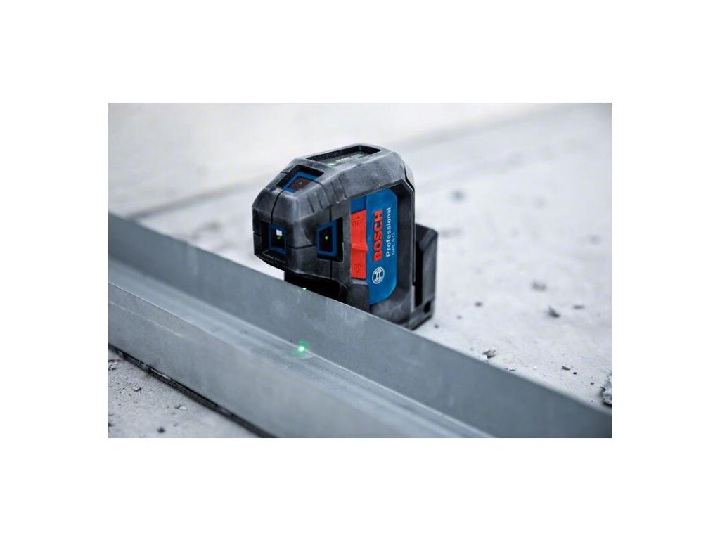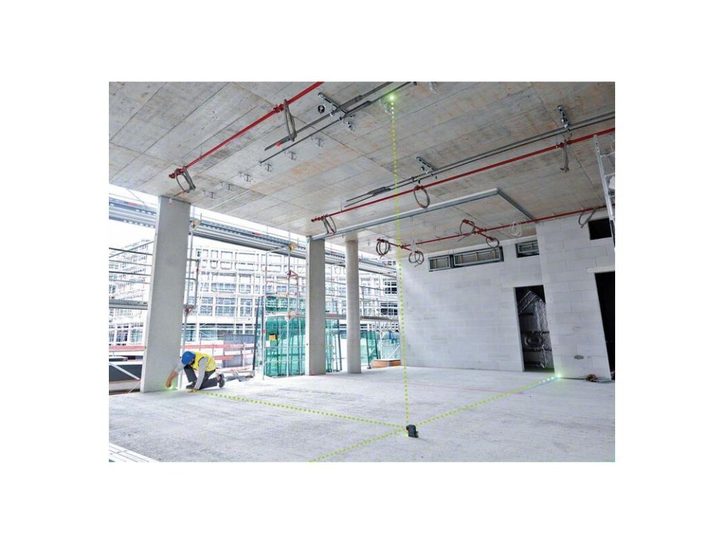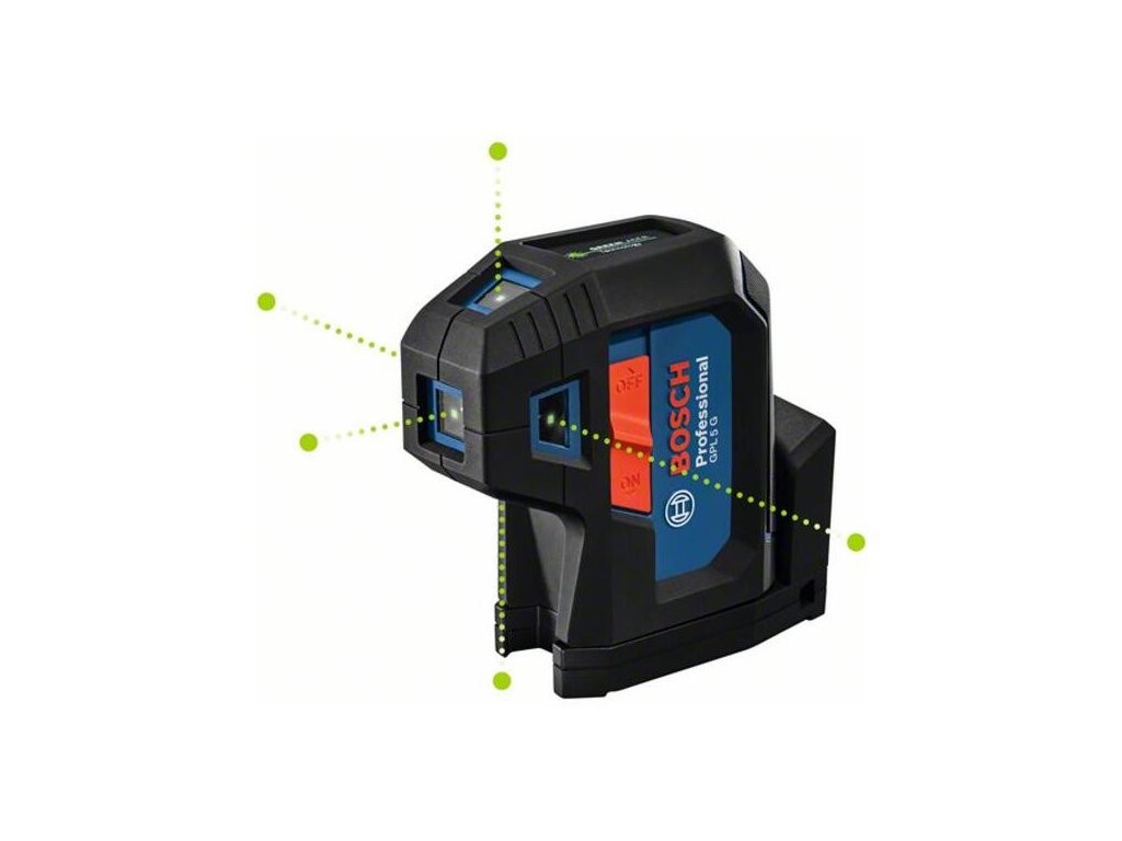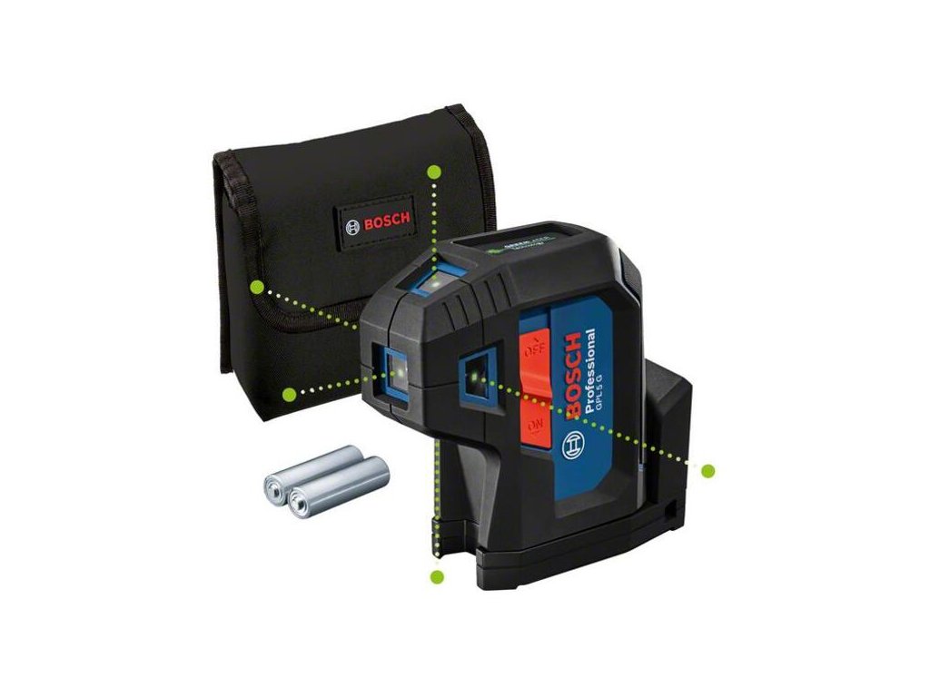 Bodový laser GPL 5 G, 5-bodový laser GPL 5 G Professional vyniká svojou odolnou a kompaktnou konštrukciou, vďaka čomu je ideálnou voľbou na zakladanie stien pod uhlom 90 stupňov. Zelené laserové body poskytujú až štvornásobne lepšiu viditeľnosť než červené body. Vďaka pogumovanému krytu a priezorom, ako aj ochrane proti prachu a striekajúcej vode na stupni IP65 odolá GPL 5 G Professional náročným podmienkam na pracovisku. Tento 5-bodový laser je okamžite pripravený na prenášanie, a to vďaka integrovanému otočnému stojanu vybavenému silnými magnetmi na rýchle a bezpečné upevnenie. GPL 5 G Professional je ideálnym prístrojom na rozdelenie miestnosti pod uhlom 90 stupňov a na prenášanie bodov z podlahy na strop. Je mimoriadne vhodný na inštalatérske práce a montáž konštrukcií suchej výstavby. Tento 5-bodový laser je takisto vybavený praktickým rozhraním s dvojpolohovým spínačom: pri zapnutí sa prístroj automaticky nivelizuje; po vypnutí sa kyvadlo uzamkne. Taška; 2× batéria 1,5 V LR6 (AA)