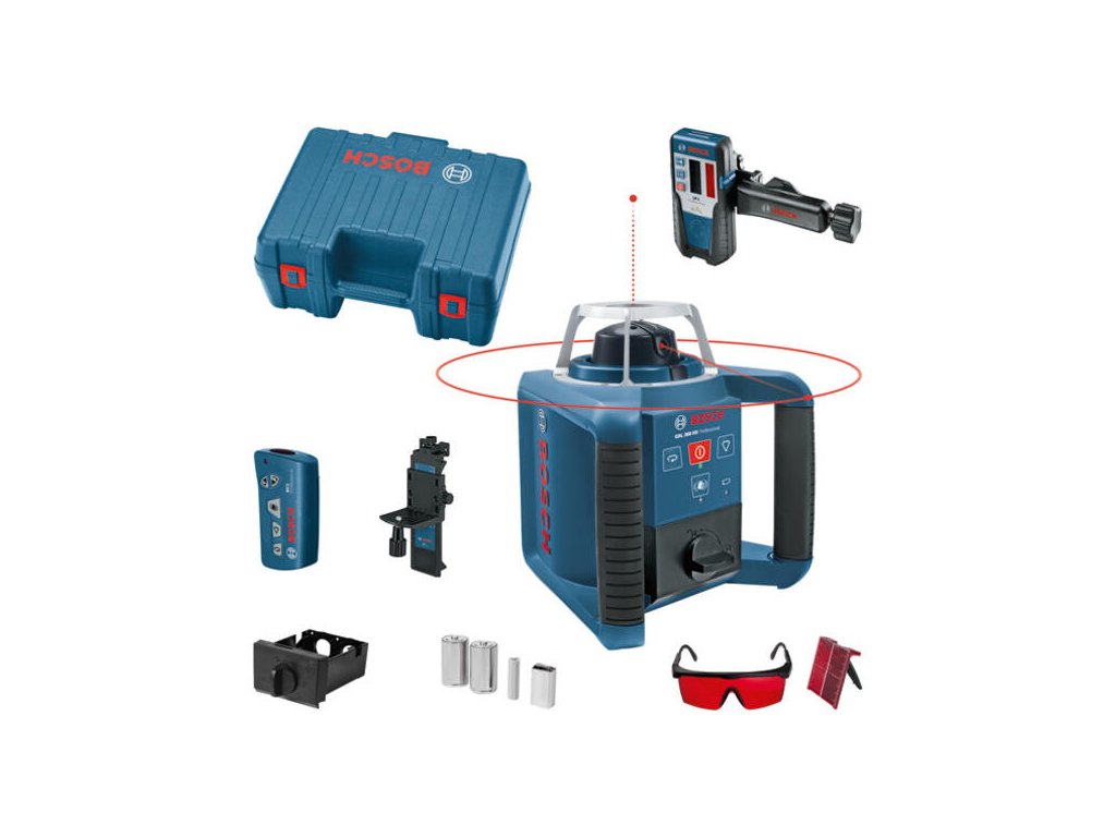 Rotačný laser GRL 300 HV, Jednoduchá obsluha s horizontálnou a vertikálnou samoniveláciou, Jednoduchá obsluha vďaka jednému tlačidlu na jednu funkciu a vďaka indikácii so samovysvetľujúcimi symbolmi, Rýchlo nastaviteľný v horizontálnom a vertikálnom použití, pomocou automatickej samonivelácie 8 % (± 5°), Zapínateľná funkcia varovania pri otrase zabraňuje chybám pri nivelácii – pri vibráciách alebo otrasoch, Laserový prijímač LR 1 Professional (0.601.015.400); Držiak (1.608.M00.70F); Diaľkové ovládanie RC1 Professional (0.601.069.900); Univerzálny držiak WM 4 Professional (0.601.092.400); Laserová cieľová platnička; Okuliare na zviditeľnenie laserového lúča; 2× batéria LR20 1,5 V (D); 1× batéria 9 V (blok) (6LR61); 1× batéria 1,5 V LR6 (AA); Kufor na prenášanie