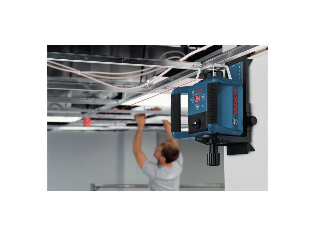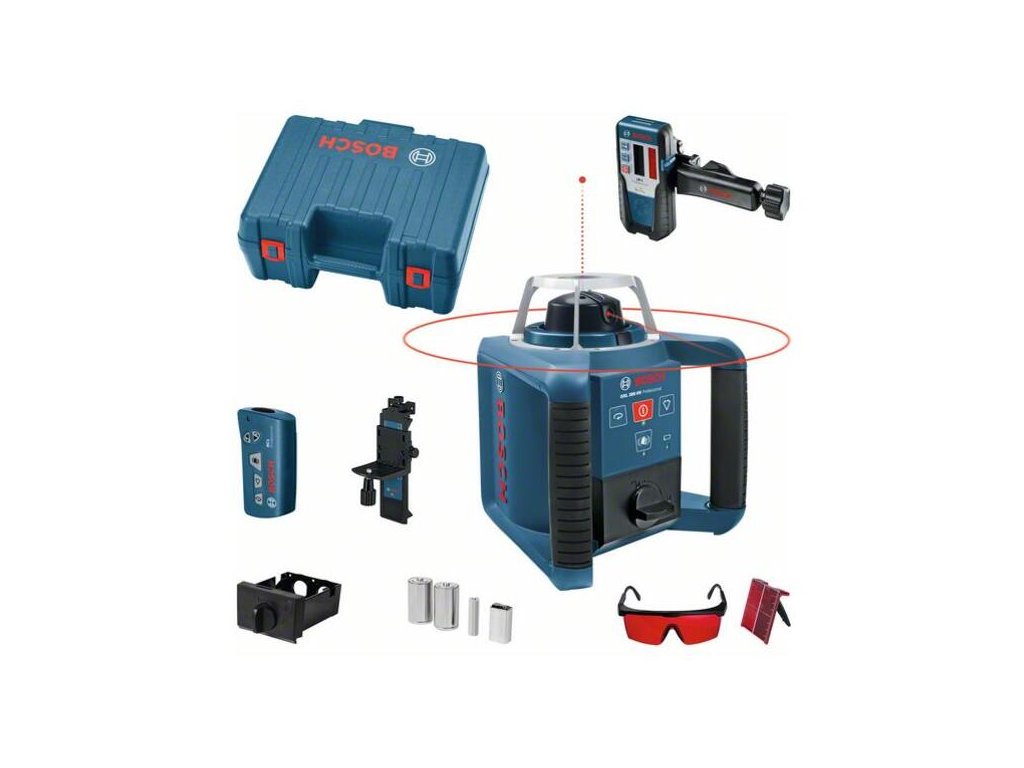 Rotačný laser GRL 300 HV, Jednoduchá obsluha s horizontálnou a vertikálnou samoniveláciou, Jednoduchá obsluha vďaka jednému tlačidlu na jednu funkciu a vďaka indikácii so samovysvetľujúcimi symbolmi, Rýchlo nastaviteľný v horizontálnom a vertikálnom použití, pomocou automatickej samonivelácie 8 % (± 5°), Zapínateľná funkcia varovania pri otrase zabraňuje chybám pri nivelácii – pri vibráciách alebo otrasoch, Laserový prijímač LR 1 Professional (0.601.015.400); Držiak dostupný aj samostatne ako príslušenstvo (katalógové číslo 1.608.M00.70F); Diaľkové ovládanie RC1 Professional (0.601.069.900); Univerzálny držiak WM 4 Professional (0.601.092.400); Priestor na akumulátor (katalógové číslo 1.608.M00.05D); Laserový terč (červený) (katalógové číslo 1.608.M00.05C); Okuliare na sledovanie laserového lúča, červené, BL-GLASS (katalógové číslo 1.608.M00.05B); 1× batéria 9 V (blok) (6LR61); 2× batéria LR20 1,5 V (D); 1× batéria 1,5 V LR6 (AA); Kufor na prenášanie