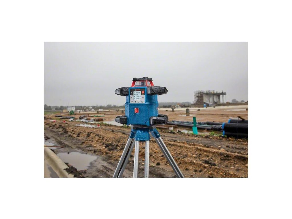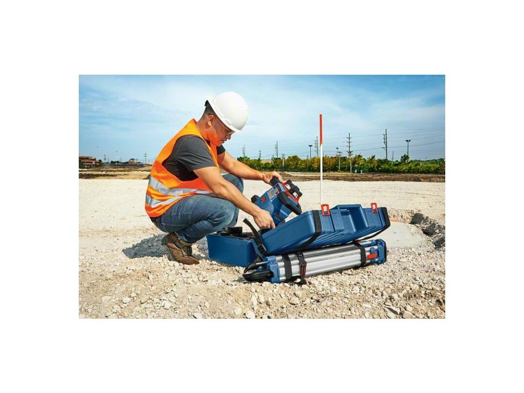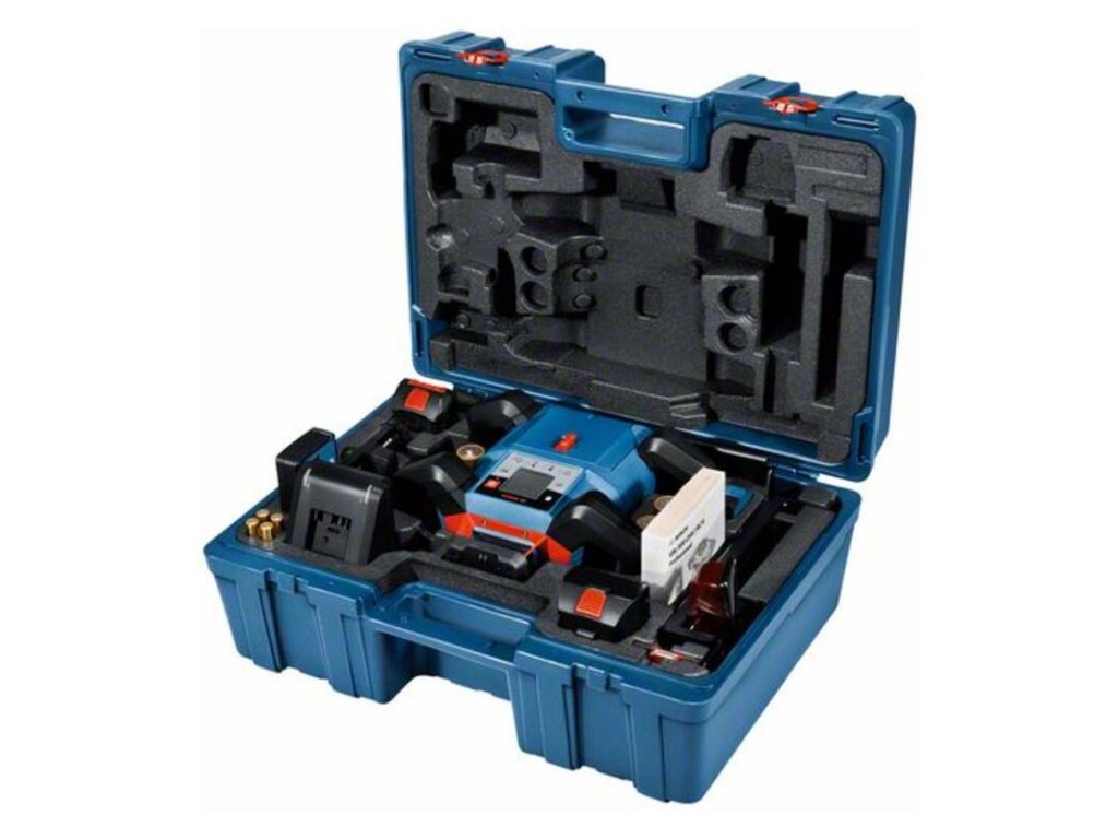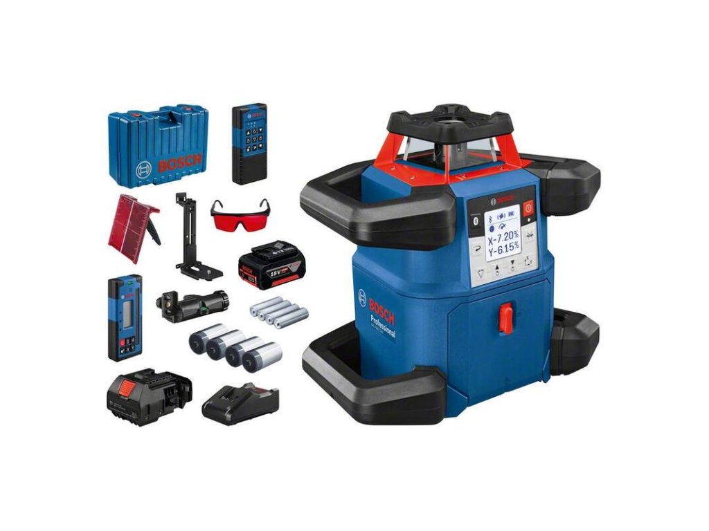 Rotačný laser GRL 600 CHV, Náročné pracovné podmienky – robustný prístroj GRL 600 CHV Professional zvládne aj tie najnáročnejšie prostredia. Odolná konštrukcia poskytuje ochranu pred nárazmi a trieda ochrany IP68 chráni pred prachom a vodou, a to vrátane priestoru na akumulátor, vďaka čomu zaručuje mimoriadne flexibilnú prácu aj v zhoršených poveternostných podmienkach. Ponúka praktickú konektivitu, umožňuje sústredenejšiu prácu a lepšiu časovú efektivitu. Ovládanie prístroja je intuitívne vďaka displeju a prístupu k aplikácii na vzdialenú nivelizáciu, ktorá vizualizuje všetky funkcie vrátane nastavenia dvojitého sklonu a ušetrí vám cenný čas. Tento veľmi presný laser ponúka dlhú dobu prevádzky a možnosť nepretržitej práce, a to vďaka systému akumulátora 18 V alebo použitím dodaných alkalických batérií. Tento prístroj je určený na používanie v exteriéri pri meraní výkopových a násypových prác, debnenia na betón, krajinárskych a fasádnych prác. GRL 600 CHV je takisto vybavený vysokokvalitným prijímačom s prijímacou plochou veľkosti 125 mm, obojstranným displejom a funkciou offsetu v milimetroch. Kalibrácia náradia je rýchla a jednoduchá – postupujte podľa jednotlivých pokynov prostredníctvom intuitívnej aplikácie, ktorá vám ušetrí čas a zdroje a zaručí presné výsledky pri každej práci. Praktický „maskovací režim“ dostupný v aplikácii zabraňuje odrazom a interferenciám s inými zariadeniami na pracovisku. Laserový prijímač LR 60 Professional (0.601.069.P00); Držiak prijímača RB 60 Professional; Diaľkové ovládanie RC 6 Professional; 1× akumulátor ProCORE18V 4.0Ah (1.600.A01.6GB); Rýchlonabíjačka GAL 18V-40 Professional (1.600.A01.9RJ); Akumulátorový adaptér BA 1 Professional; Nástenný držiak WM 6 Professional; 4× batéria LR20 1,5 V (D); 4× batéria 1,5 V LR6 (AA); Laserová cieľová platnička; Okuliare na sledovanie laserového lúča, červené, BL-GLASS (katalógové číslo 1.608.M00.05B); Kufor na prenášanie