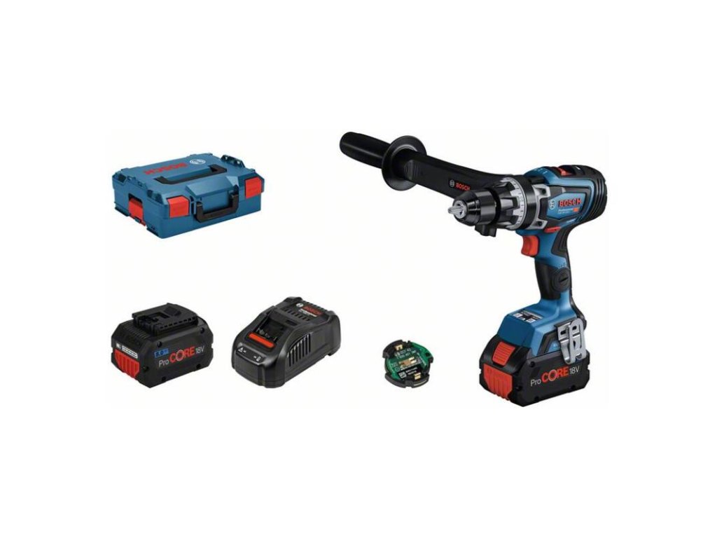 Akumulátorový príklepový vŕtací skrutkovač GSB 18V-150 C, GSB 18V-150 C Professional je inteligentný príklepový vŕtací skrutkovač, ktorý ponúka bezkonkurenčný výkon a ovládanie a umožňuje jednoduchú, všestrannú prácu. Je to vynikajúce náradie na skrutkovanie, vŕtanie a príklepové vŕtanie a umožňuje extrémne rýchlu prácu vďaka výnimočne výkonným akumulátorom ProCORE18V a bezuhlíkovému motoru s technológiou BITURBO s maximálnym krútiacim momentom 150 Nm. Dômyselná funkcia Electronic Angle Detection vždy zaručí správny uhol dlhých skrutiek a vypínateľná funkcia KickBack Control na prácu s vykružovacími pílami znižuje riziko náhleho rázu pri zaseknutí nástroja. Vďaka kovovému skľučovadlu a kovovej prevodovke je príklepová vŕtačka extrémne spoľahlivá a robustná vždy, keď je to skutočne potrebné. Toto je ideálne náradie na skrutkovanie, vŕtanie a príklepové vŕtanie do rozličných materiálov, ako napr. dreva, kovu a muriva. Prídavná rukoväť (1.602.025.07Y); 2× akumulátor ProCORE18V 8.0Ah (1.600.A01.93N); 1× modul Bluetooth Low Energy GCY 42 Professional (1.600.A01.3WF); Rýchlonabíjačka GAL 1880 CV (1.600.A00.B8G); L-BOXX 136 (1.600.A01.2G0); Vložka L-BOXX na náradie
