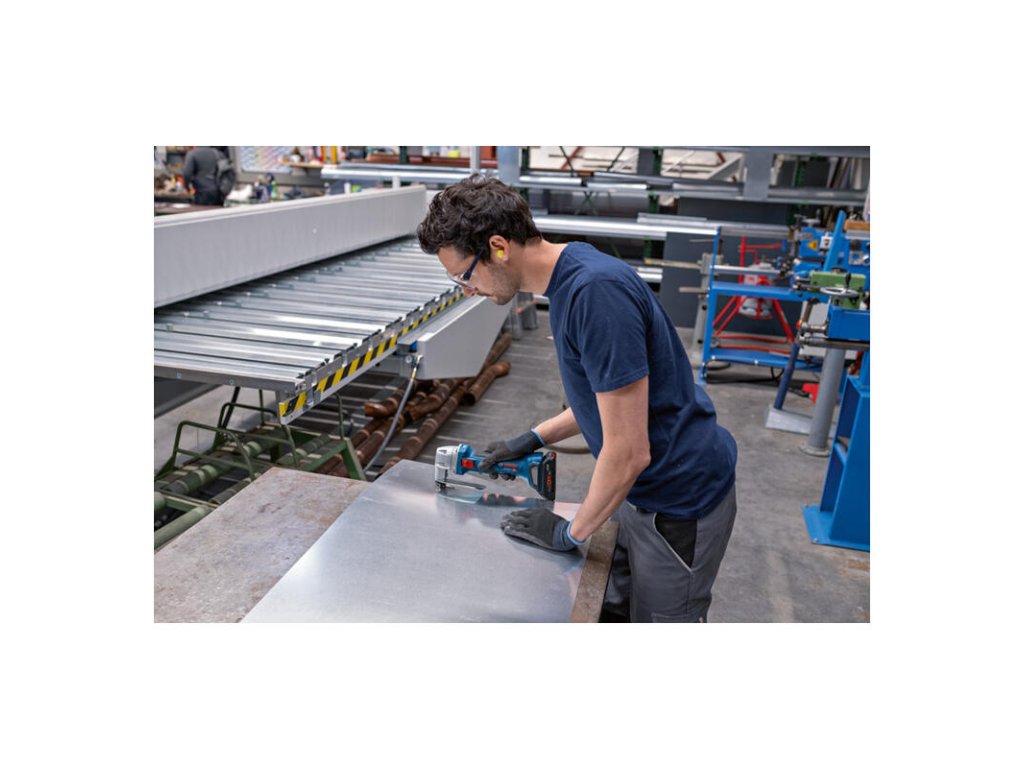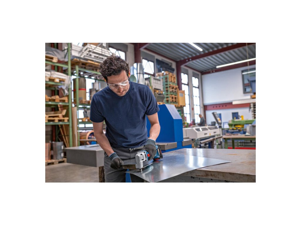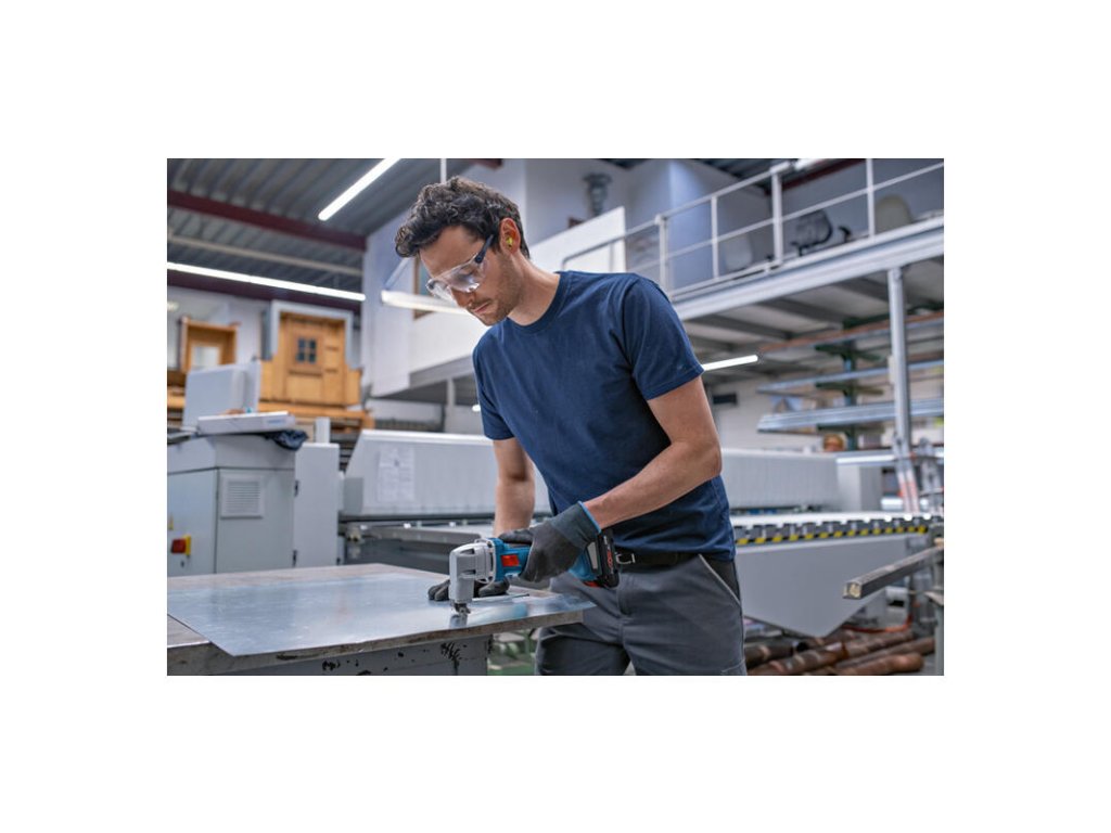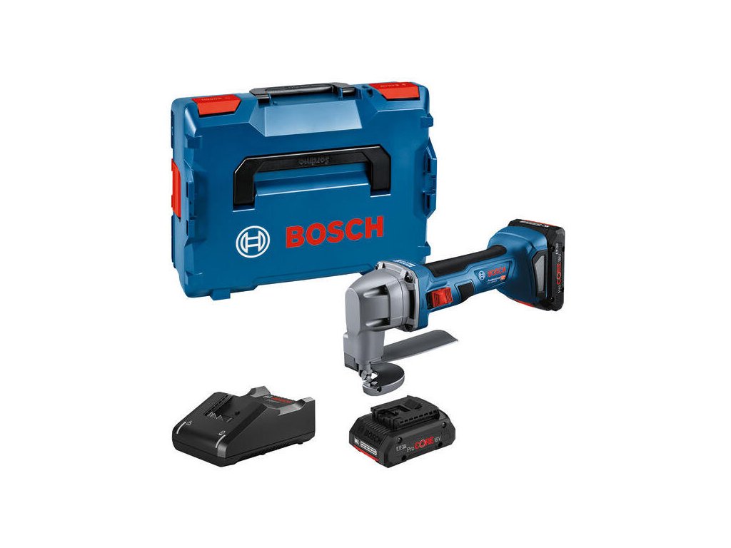 Akumulátorové nožnice na plech GSC 18V-16 E, Akumulátorové nožnice na plech GSC 18V-16 E strihajú s rovnakým výkonom ako elektrické nožnice triedy 700 W, a to vďaka technológii efektívneho bezuhlíkového motora. Tieto nožnice sú vynikajúco vyvážené, ľahké a zoštíhlená rukoväť dĺžky 156 mm zaručuje komfortnú manipuláciu pri práci. Vďaka vysokokvalitnej konštrukcii, bezuhlíkovému motoru a komponentom nevyžadujúcim údržbu sú tieto robustné nožnice ideálnou voľbou na výkonné, dlhodobé strihanie plechu. Výkonné nožnice umožňujú strihanie rozmanitých oceľových a hliníkových plechov, ventilačných rúr a kanálov. Náradie je kompatibilné so všetkými akumulátormi a nabíjačkami Bosch Professional triedy 18 V (Profesionálny 18 V systém). L-BOXX 136 (1.600.A01.2G0); 2× akumulátor ProCORE18V 4.0Ah (1.600.A01.6GB); Rýchlonabíjačka GAL 18V-40 Professional (1.600.A01.9RJ); 1× vrchná a spodná čepeľ do nožníc na plech (2.608.635.243)