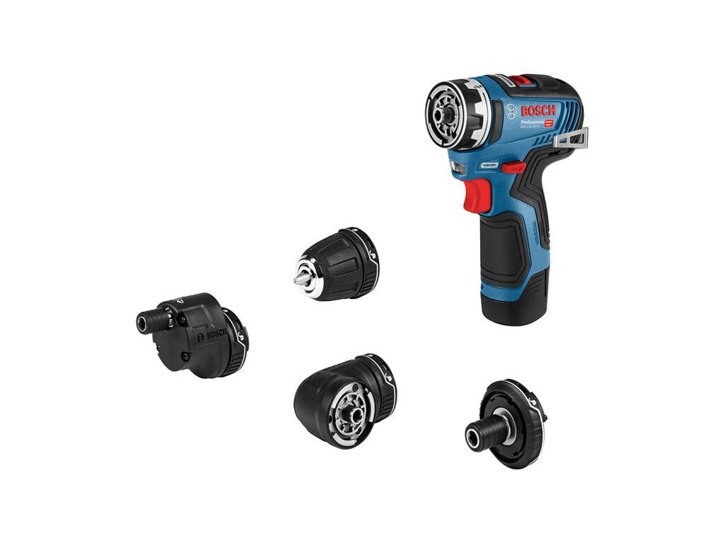 Akumulátorový vŕtací skrutkovač GSR 12V-35 FC, Akumulátorový vŕtací skrutkovač GSR 12V-35 FC Professional s bezuhlíkovým motorom je najvšestrannejšie náradie v kategórii 12 V na akúkoľvek prácu. FlexiClick System zahrnuje štyri nadstavce (vŕtacie skľučovadlo 10 mm, aretovateľný držiak skrutkovacích hrotov, pravouhlý adaptér a excentrický uhlový adaptér), ktoré možno ľahko vymeniť, kombinovať a nastaviť a ponúka až osem konfigurácií na najvyššiu flexibilitu. Extrémne kompaktné náradie s vysokým výkonom 35 Nm a 1 750 ot/min umožňuje optimálnu manipuláciu a je vynikajúce na prácu na ťažko prístupných miestach. Bezuhlíkový motor spolu s funkciou elektronickej ochrany motora Electronic Motor Protection zabraňuje preťažovaniu a zaručuje dlhšiu životnosť náradia. Toto náradie je vynikajúce na vŕtanie a skrutkovanie do dreva (32 mm) a ocele (10 mm). Je kompatibilné so všetkými akumulátormi a nabíjačkami Bosch Professional triedy 12 V. Nadstavec pre vŕtacie kladivo GFA 12-H (1.600.A02.4LN); Nadstavec s upínacím skľučovadlom GFA 12-B (1.600.A00.F5H); Excentrický nadstavec GFA 12-E (1.600.A00.F5L); Pravouhlý nadstavec GFA 12-W (1.600.A00.F5K); Nadstavec s držiakom skrutkovacích hrotov GFA 12-X (1.600.A00.F5J); 2× akumulátory GBA 12V 3.0Ah (1.600.A00.X79); Rýchlonabíjačka GAL 12V-40 Professional (1.600.A01.9R3); Prídavná rukoväť; Hĺbkový doraz; L-BOXX 102 (1.600.A01.2FZ)
