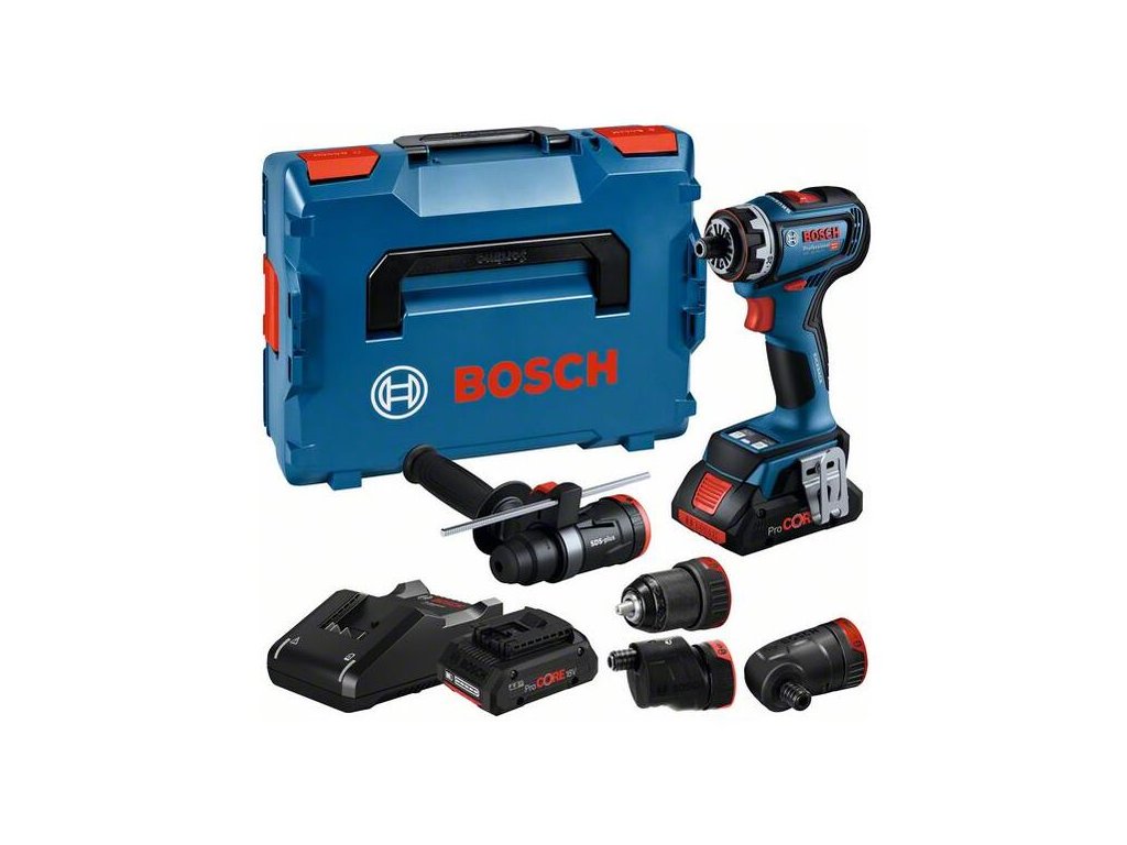 Akumulátorový vŕtací skrutkovač GSR 18V-90 FC, Výkonné náradie GSR 18V-90 FC Professional je súčasťou systému FlexiClick System Bosch Professional, ktorý je pripravený na všetky výzvy na pracovisku: excentrický nadstavec umožňuje prácu v blízkosti okrajov a stien; pravouhlý nadstavec zmení vŕtací skrutkovač na uhlovú vŕtačku. Tieto nadstavce je možné zaistiť v 16 rôznych polohách v rozsahu 360° bez nutnosti ich odoberania z náradia. Pripojením jedinečného príklepového nadstavca GFA 18-H sa náradie zmení na plnohodnotné vŕtacie kladivo SDS plus pripravené na príklepové vŕtanie bez námahy do betónu až do Ø 10 mm. Vďaka dĺžke hlavy len 136 mm a max. tvrdému krútiacemu momentu 64 Nm máte k dispozícii mimoriadne kompaktné a výkonné náradie. FlexiClick System Bosch Professional – vynikajúco pripravený na profesionálnu prácu. Je to vynikajúce náradie na skrutkovanie a vŕtanie do dreva, kovu a (spolu s GFA 18-H) do betónu, muriva a kameňa. Kovový nadstavec s upínacím skľučovadlom GFA 18-M Professional (1.600.A01.3P6); Excentrický uhlový nadstavec GFA 18-E Professional (1.600.A00.1SJ); Uhlový nadstavec GFA 18-W Professional (1.600.A01.3P7); Nadstavec pre kladivo vrátane prídavnej rukoväte GFA 18-H Professional (1.600.A00.3NF); Hĺbkový doraz; 2× akumulátor ProCORE18V 4.0Ah (1.600.A01.6GB); Rýchlonabíjačka GAL 18V-40 Professional (1.600.A01.9RJ); L-BOXX 136 (1.600.A01.2G0); Vložka pre L-BOXX 136