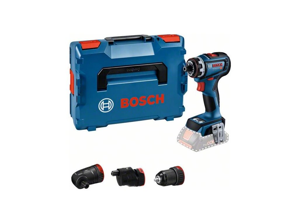 Akumulátorový vŕtací skrutkovač GSR 18V-90 FC, Výkonné náradie GSR 18V-90 FC Professional je súčasťou systému FlexiClick System Bosch Professional, ktorý je pripravený na všetky výzvy na pracovisku: excentrický nadstavec umožňuje prácu v blízkosti okrajov a stien; pravouhlý nadstavec zmení vŕtací skrutkovač na uhlovú vŕtačku. Tieto nadstavce je možné zaistiť v 16 rôznych polohách v rozsahu 360° bez nutnosti ich odoberania z náradia. Pripojením jedinečného príklepového nadstavca GFA 18-H sa náradie zmení na plnohodnotné vŕtacie kladivo SDS plus pripravené na príklepové vŕtanie bez námahy do betónu až do Ø 10 mm. Vďaka dĺžke hlavy len 136 mm a max. tvrdému krútiacemu momentu 64 Nm máte k dispozícii mimoriadne kompaktné a výkonné náradie. FlexiClick System Bosch Professional – vynikajúco pripravený na profesionálnu prácu. Je to vynikajúce náradie na skrutkovanie a vŕtanie do dreva, kovu a (spolu s GFA 18-H) do betónu, muriva a kameňa. Kovový nadstavec s upínacím skľučovadlom GFA 18-M Professional (1.600.A01.3P6); Excentrický uhlový nadstavec GFA 18-E Professional (1.600.A00.1SJ); Uhlový nadstavec GFA 18-W Professional (1.600.A01.3P7); L-BOXX 136 (1.600.A01.2G0); Vložka pre L-BOXX 136