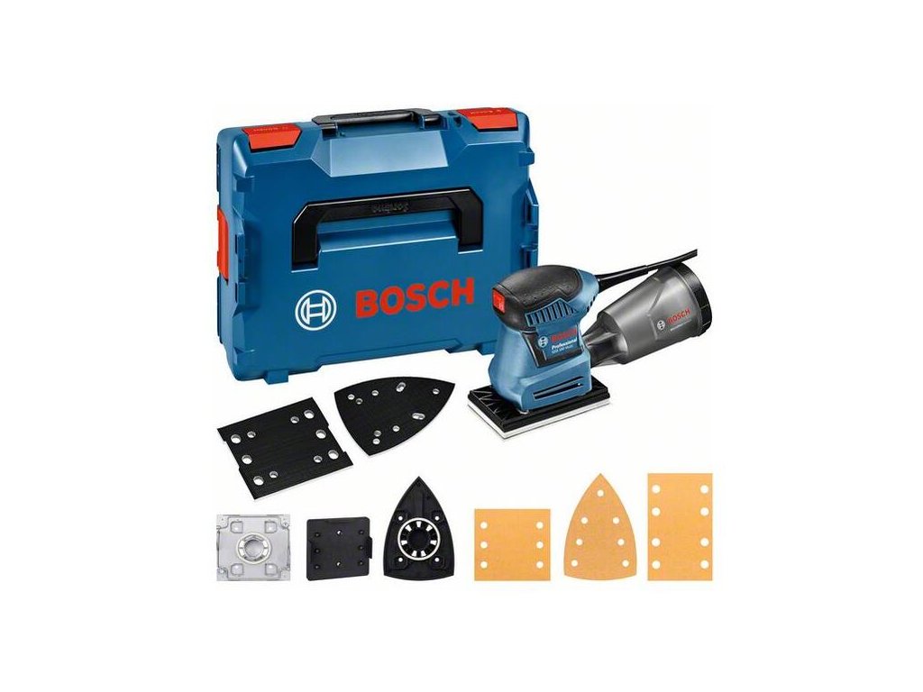 Vibračná brúska GSS 160 Multi, GSS 160 Professional Multi je kompaktná a ergonomická elektrická vibračná brúska Bosch, ktorá zvládne všestranné použitie vrátane brúsenia rohov. Ergonomická dlaňová opierka a kompaktná konštrukcia zaručujú jednoduchú a komfortnú manipuláciu. Obsahuje tri výmenné taniere umožňujúce brúsenie hrán a rohov, ako aj malých rovných plôch. Nádoba na prach je vybavená vstavaným mikrofiltračným systémom Bosch zaručujúcim efektívne odsávanie prachu a takmer bezprašnú prácu. Táto vibračná brúska je určená na prebrusovanie, finálnu povrchovú úpravu a brúsenie rohov a malých rovných plôch. Možno ju použiť na drevo, dyhu, nátery, tmely, ako aj minerálne či akrylové povrchy. Je kompatibilná so systémom Bosch Click & Clean. GSS 160 Professional Multi je takisto vybavená upínacím systémom, systémom so suchým zipsom na upnutie brúsneho papiera a je navrhnutá na ovládanie jednou rukou. L-BOXX 136 (1.600.A01.2G0); Vložka L-BOXX; Nástroj na dierkovanie (2.608.190.059); Skrutkovač; Schránka na prach (2.605.411.240) vrátane mikrofiltra (2.605.411.241); 1× brúsny list C470, Best for Wood + Paint, 120 (dostupný samostatne ako súprava 10 kusov: 2.608.607.232); 1× brúsny list C470, Best for Wood + Paint, 120 (dostupný samostatne ako súprava 10 kusov: 2.608.607.458); 1× brúsny list C470, Best for Wood + Paint, 120 (dostupný samostatne ako súprava 10 kusov: 2.608.608.Z96); Základná doska v tvare delta, 100 × 150 mm (2.608.601.448) s brúsnou doskou (2.608.601.445); Základná doska 113 × 101 mm (2.608.601.446) s brúsnou doskou (2.608.601.443); Základná doska 80 × 130 mm (2.608.601.447) s brúsnou doskou (2.608.601.444)