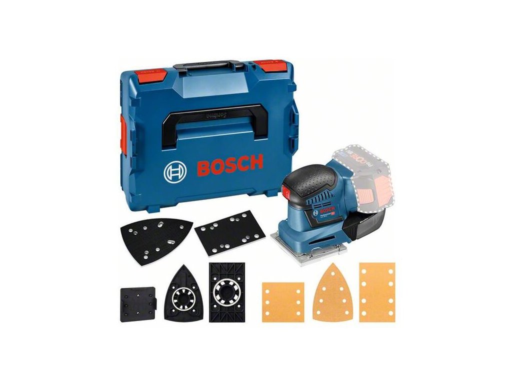 Akumulátorová vibračná brúska GSS 18V-10, Kompaktná a praktická jednoručná akumulátorová vibračná brúska, Akumulátorová vibračná brúska – vojde do každého rohu, Flexibilná práca v každej situácii vďaka akumulátoru s napätím 18 V, Mikrofiltračný systém Bosch na účinné odsávanie, L-BOXX 136 (1.600.A01.2G0); Vložka L-BOXX; Nástroj na dierkovanie (2.608.190.059); Schránka s mikrofiltrom; Skrutkovač; 1× brúsny list C470, Best for Wood + Paint, 120 (dostupný samostatne ako súprava 10 kusov: 2.608.607.232); 1× brúsny list C470, Best for Wood + Paint, 120 (dostupný samostatne ako súprava 10 kusov: 2.608.607.458); 1× brúsny list C470, Best for Wood + Paint, 120 (dostupný samostatne ako súprava 10 kusov: 2.608.608.Z96); Základná doska v tvare delta, 100 × 150 mm (2.608.601.448) s brúsnou doskou (2.608.601.445); Základná doska 113 × 101 mm (2.608.601.446) s brúsnou doskou (2.608.601.443); Základná doska 80 × 130 mm (2.608.601.447) s brúsnou doskou (2.608.601.444)