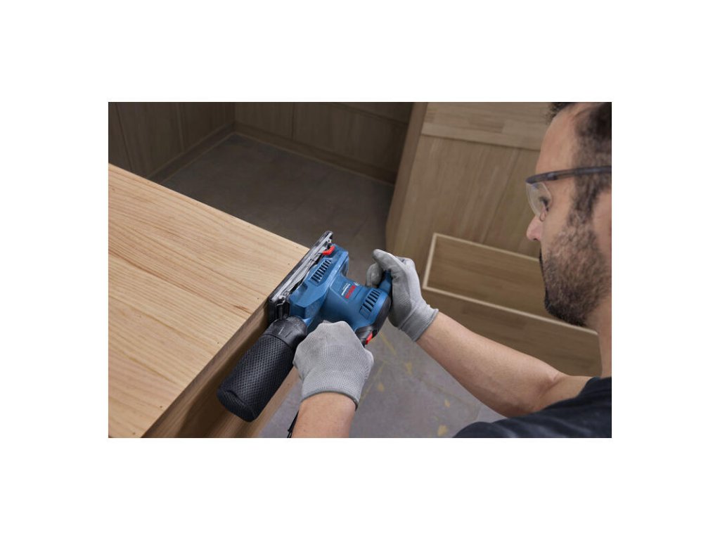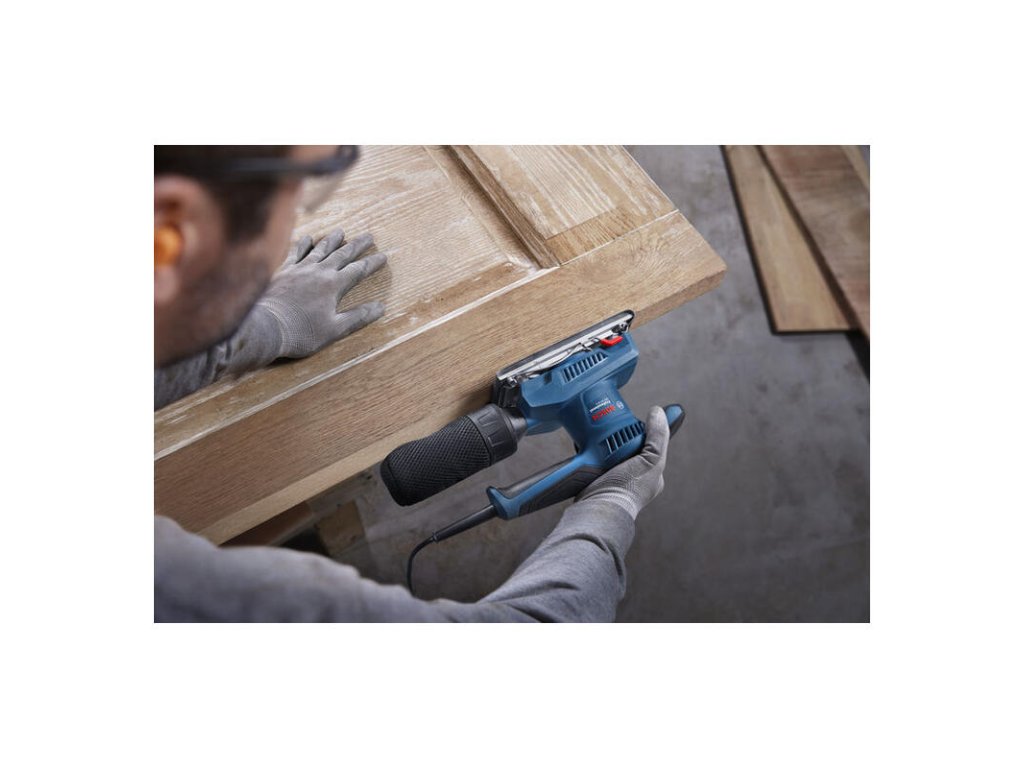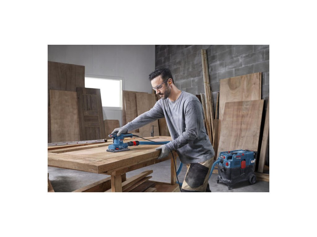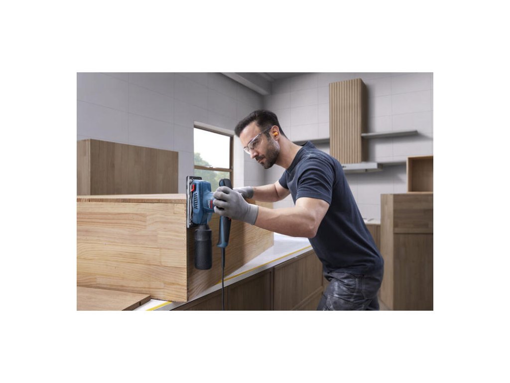 Brúska disponuje integrovaným odsávaním prachu do mikrofiltračného boxu, čo zaručuje čistý vzduch a dobrú viditeľnosť na obrobok. Flexibilný upínací systém umožňuje používať brúsne papiere so suchým zipsom aj bez neho. Je to ideálny pomocník pre finálne úpravy dreva, lakovaných povrchov či tmelov.