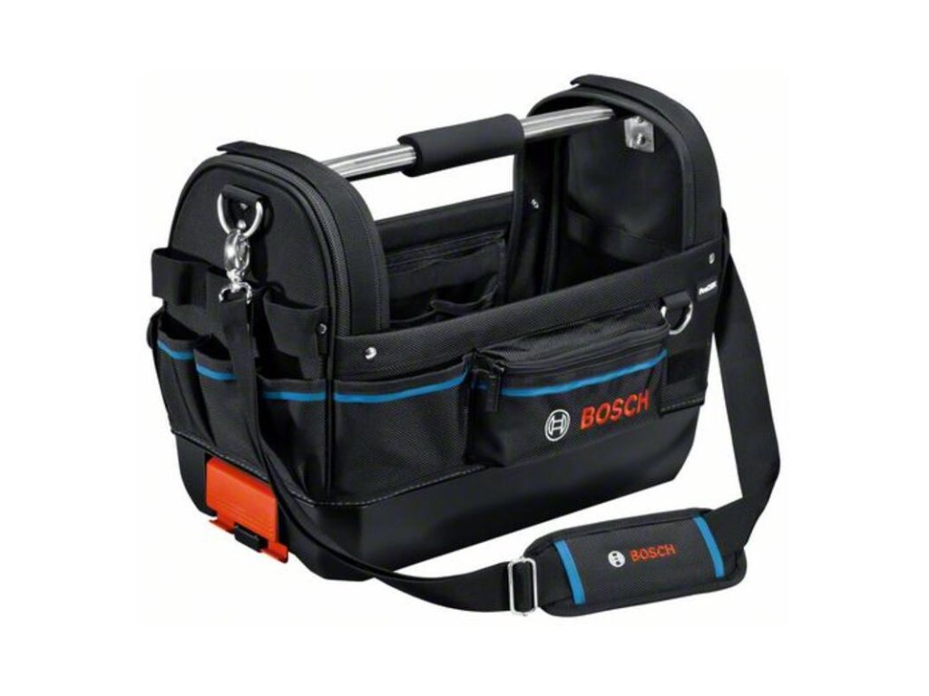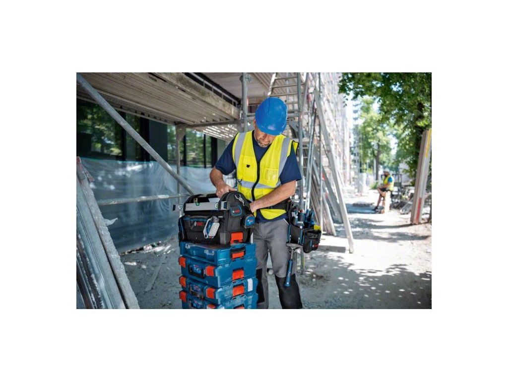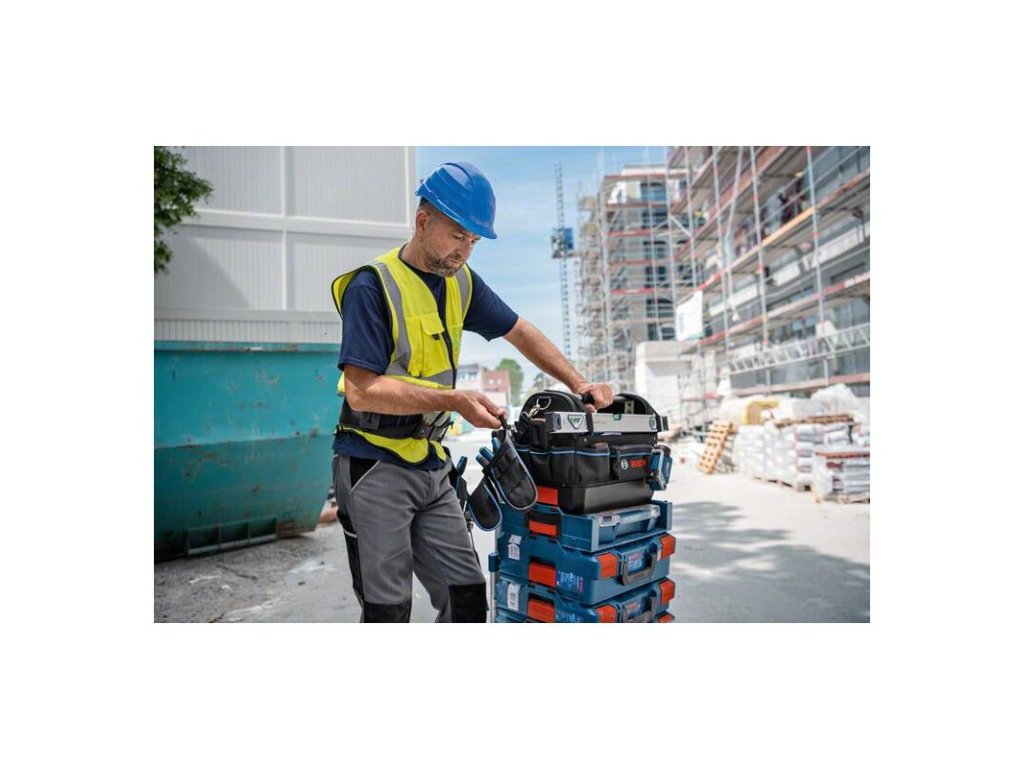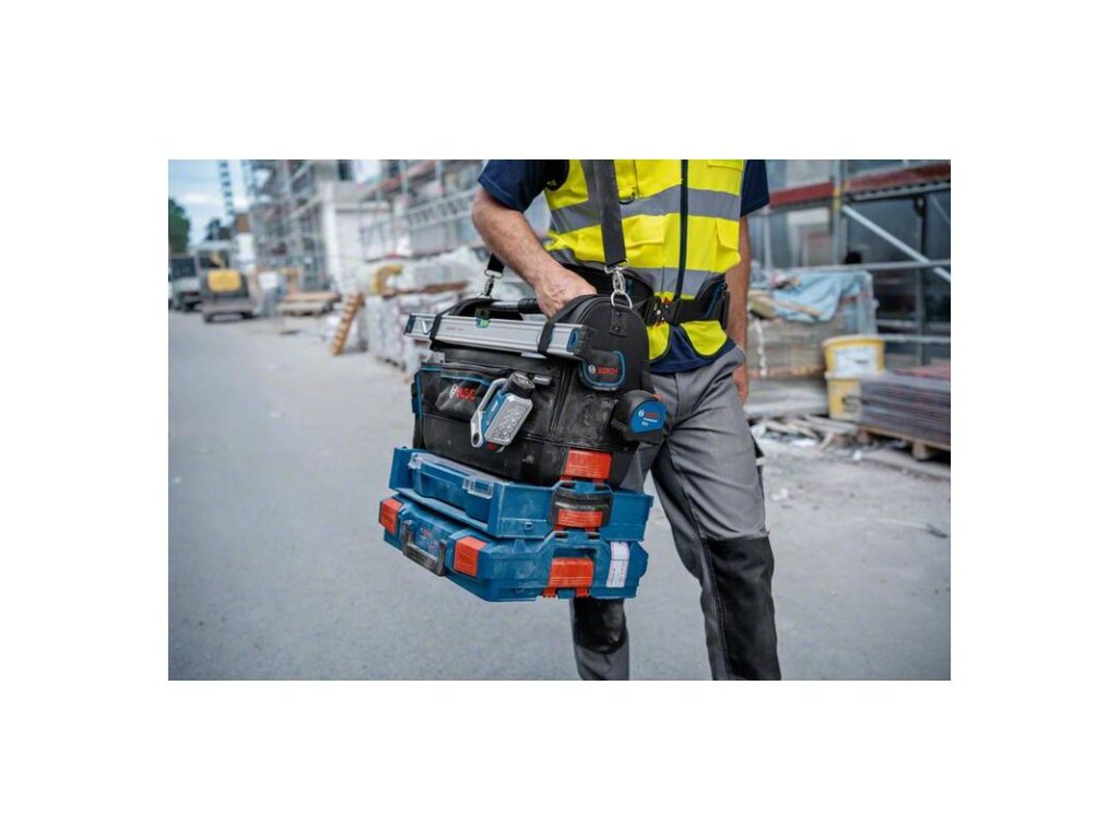 Taška na náradie GWT 20, Taška na náradie GWT 20 Bosch Professional umožňuje jednoduché uloženie a praktické prenášanie všetkého potrebného náradia a je kompatibilná so systémom Bosch Mobility System. Všestranné oddiely a vrecká ponúkajú rýchly prístup a individuálne usporiadanie náradia; ďalšie integrované pásky umožňujú pripojenie držiaka ProClick a puzdier. Vďaka tvarovanej spodnej časti odolnej voči nárazom je taška na náradie GWT 20 mimoriadne odolná a trvanlivá. Integrované zaisťovacie úchyty umožňujú spojenie a zapnutie na kufor L-BOXX a zaisťujú bezpečnú prepravu. Táto taška na náradie predstavuje jednoduchý a praktický spôsob prepravy základného náradia na miesto práce. Je vyrobená z odolného polyesteru 1000D, má ergonomickú rukoväť, polstrovaný popruh na rameno a poskytuje dlhú životnosť a maximálny komfort. Je kompatibilná s kufrom L-BOXX a systémom ProClick Bosch Professional, čo umožňuje jednoduché pripojenie, výmenu a prispôsobenie puzdier na opasok ProClick bez nutnosti odopínania opaska.