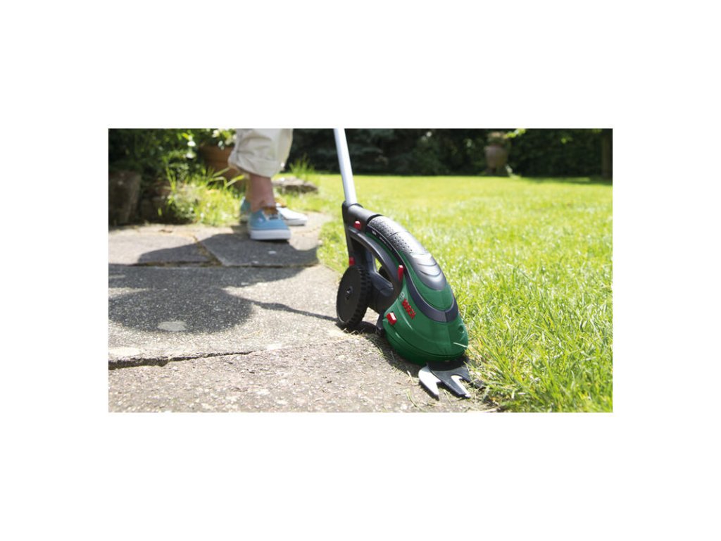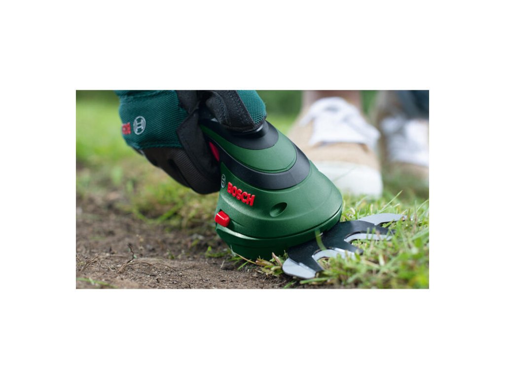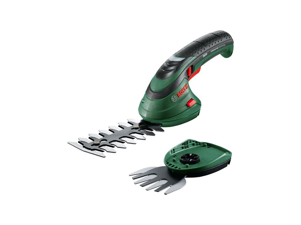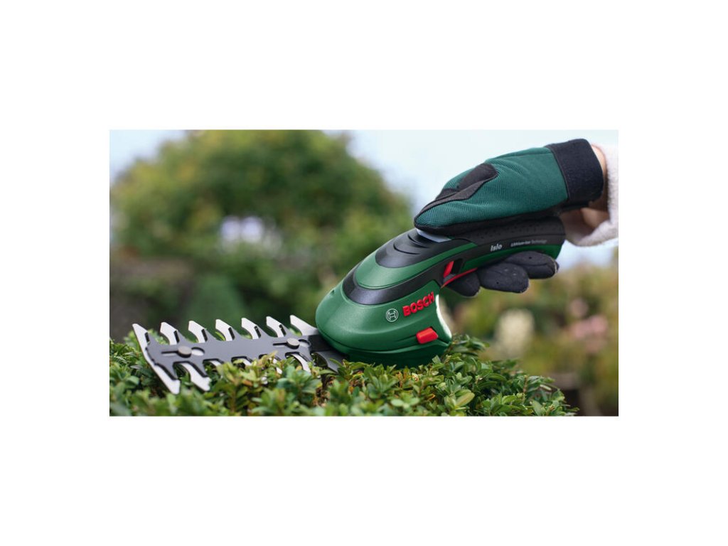 Akumulátorové nožnice na kríky a trávu Isio; Nepostrádateľný pomocník v záhrade; Kompaktné ručné náradie, perfektné na tvarovanie kríkov a krovín; Ľahký a ergonomický dizajn pre komfort a strihanie bez námahy.; Odolný, 3,6 V lítiovo-iónový akumulátor je vždy pripravený na použitie s výdržou až 50 minút.; Silný pohon a antiblokovací systém pre mimoriadny výkon strihania a bez blokovania.; Čepeľ na strihanie trávy Multi-Click 8 cm (F 016 800 326); Nôž pre nožnice na kríky Multi-Click 12 cm (F 016 800 327); Nabíjačka; Mäkký vak