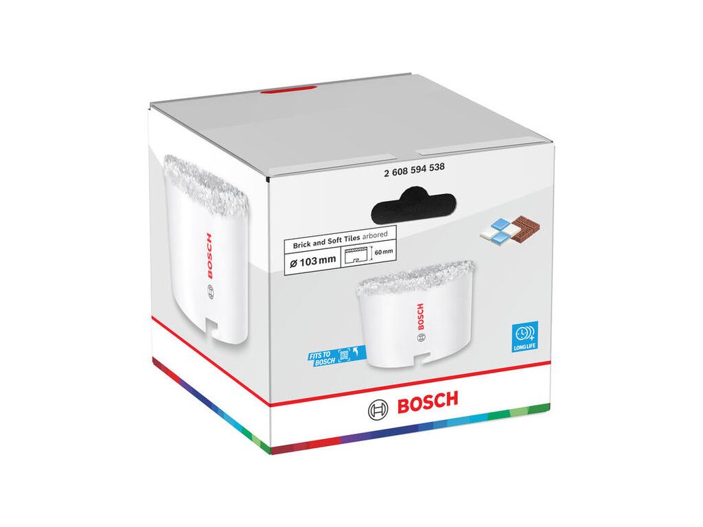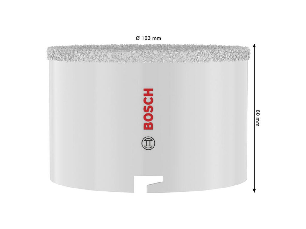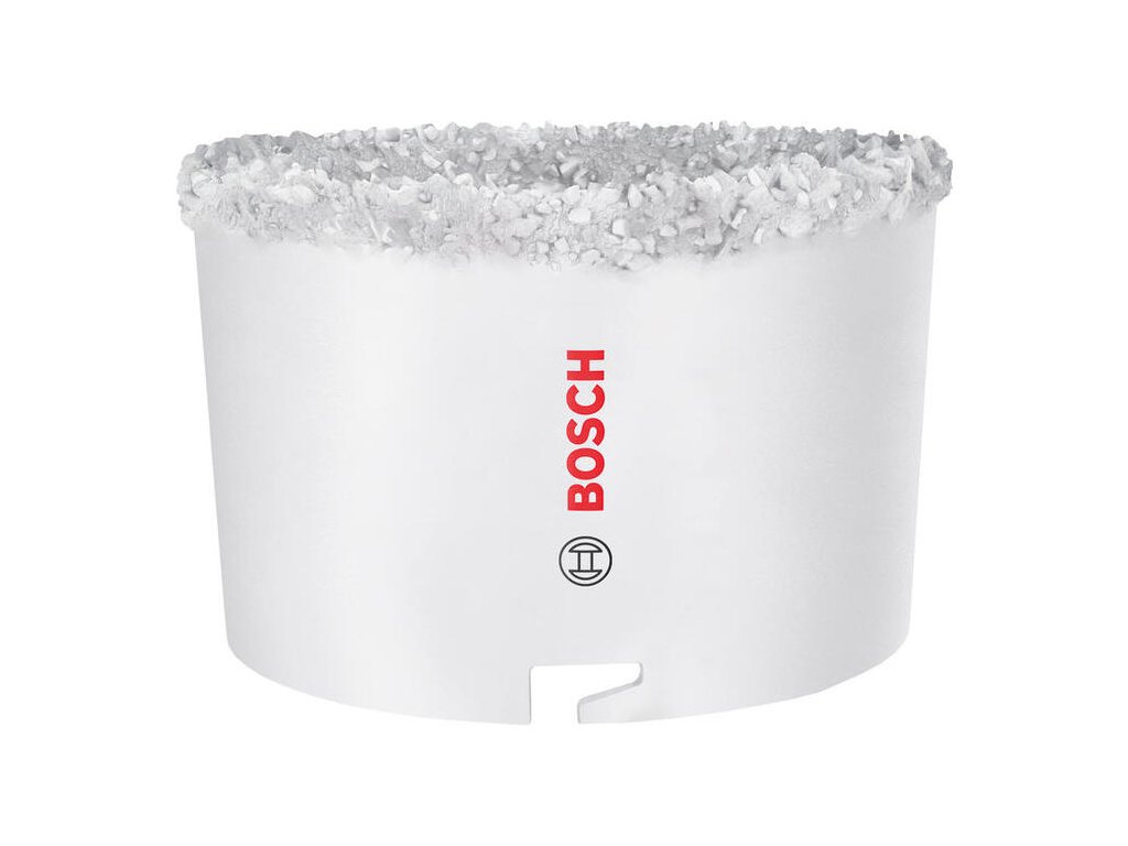 Pre veľké otvory v murive, napríklad pre ventiláciu, je tu dierovka Bosch s priemerom 103 mm. Namiesto zubov využíva odolný karbidový posyp (drvina), ktorý si hravo poradí s tehlou, pórobetónom aj mäkkými obkladačkami.