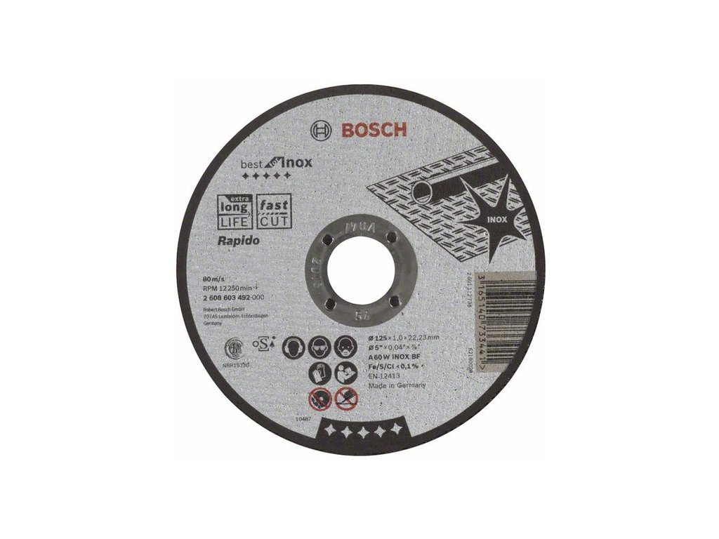 Rezací kotúč Best for Inox má vynikajúcu životnosť pri rezaní materiálu Inox. Vďaka svojmu brúsnemu zrnu s keramickým poťahom má kotúč vysokú odolnosť voči opotrebeniu a zaručuje stálu kvalitu a minimálnu tvorbu ostrapkov alebo stratu modrého sfarbenia pôsobením tepla. Kotúč neobsahuje železnaté, sírnaté alebo chlórované výplne. Jeho presne vyrobená sieť zo skleneného vlákna zaisťuje vysokú stabilitu a bezpečnosť pri rezaní. Tento kotúč používajte na rezanie materiálu Inox. Je vhodný pre uhlové brúsky. Rezacie kotúče Bosch spĺňajú maximálne požiadavky na bezpečnosť, napríklad normy EN 12413, FEPA a oSa.
