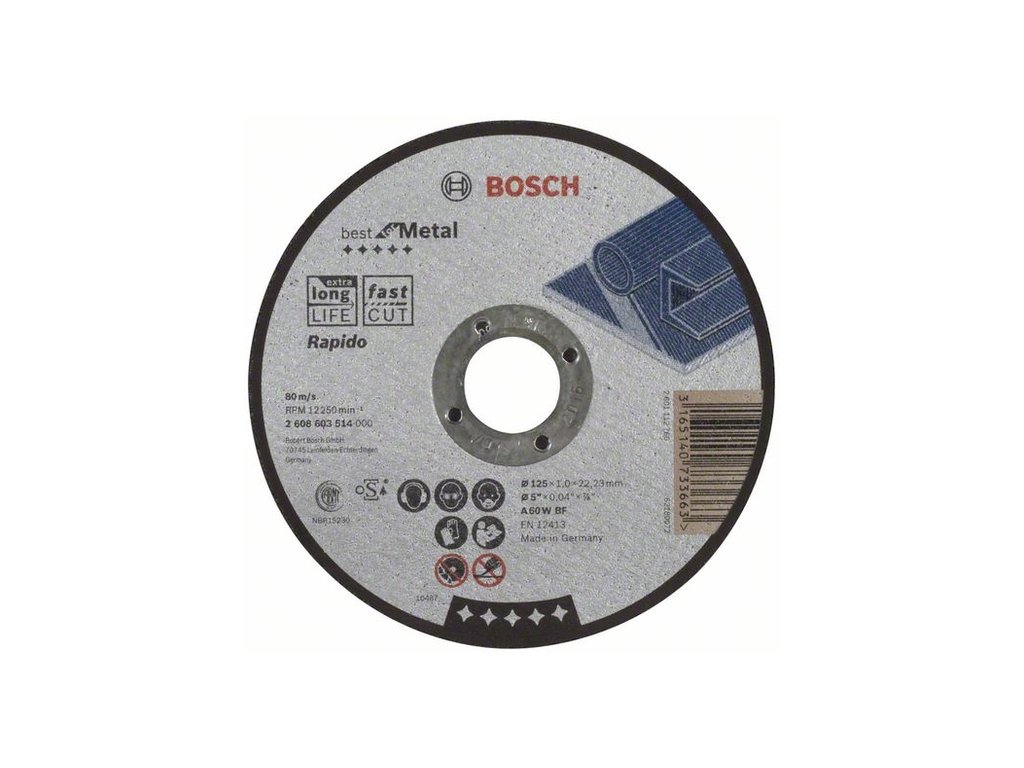 Rezacie kotúče Best in Metal majú vynikajúcu životnosť pri náročnom rezaní materiálov. Vďaka svojmu brúsnemu zrnu s keramickým poťahom má kotúč vysokú odolnosť voči opotrebeniu a zaručuje stálu kvalitu. Životnosť kotúča významne predlžuje hrúbka jeho rezacieho kolieska. Rezací kotúč Best for Metal má presne vyrobenú výstužnú sieť zo skleneného vlákna, ktorá zaisťuje vysokú stabilitu, trvácnosť a bezpečnosť pri rezaní. Tento kotúč používajte na rezanie rôznych kovových výrobkov. Je vhodný pre uhlové brúsky. Rezacie kotúče Bosch spĺňajú maximálne požiadavky na bezpečnosť, napríklad normy EN 12413, FEPA a oSa.