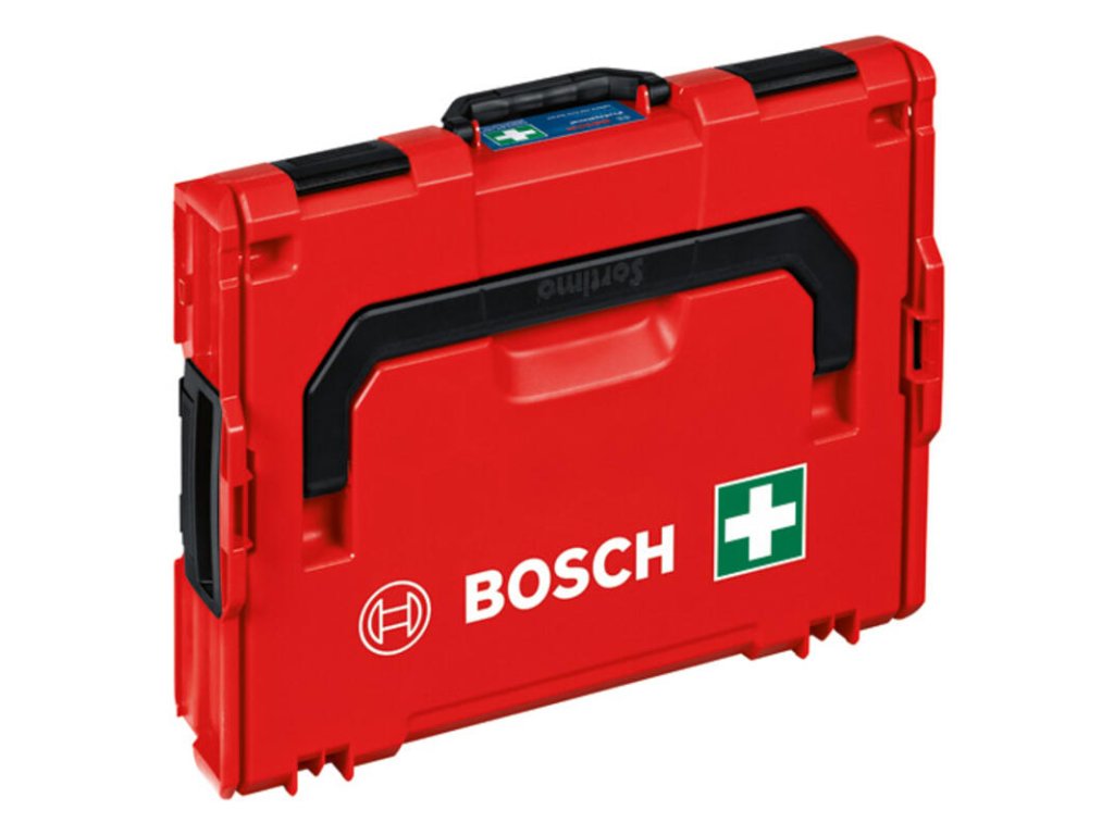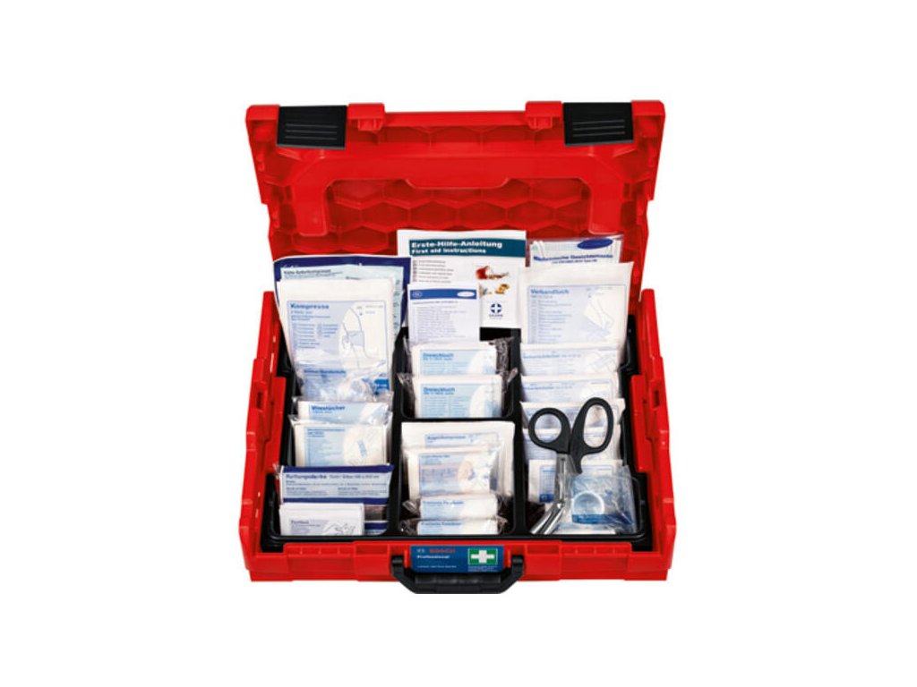 Systém prenosných kufrov Lekárnička v kufri L-BOXX 102, Ako profesionáli dobre viete, že nehody sa môžu stať. Takisto viete, že keď sa stanú, potrebujete mať lekárničku poruke. Teší nás, že môžeme pomôcť: lekárnička Bosch Professional zodpovedá DIN 13157 a nachádza sa v kufri L-BOXX 102, ktorý je súčasťou systému Bosch Mobility. Poskytuje tak plnú flexibilitu, keďže lekárnička je kompatibilná so všetkými variantmi kufra L-BOXX. Bezpečné zaisťovacie západky a odolný materiál kufra L-BOXX sú hlavnými prvkami jeho odolnej konštrukcie; ďalšia predná rukoväť uľahčuje prenášanie kufra pri tele. Kufor L-BOXX s lekárničkou je červený. V prípade núdzovej situácie ho ľahko nájdete medzi modrými kuframi L-BOXX. Stačí len upevniť lekárničku na vrch iného kufra L-BOXX – s ostatným vybavením – a komfortne ju preniesť na ďalšie stavenisko. Kufor L-BOXX s lekárničkou je vhodný na uloženie a prepravu v systémoch do vozidiel Sortimo, Aluminium Caddy a L-BOXX Roller. 1× lepiaca páska, DIN 13019, 2,5 cm × 5 m; 12× lepiaca náplasť, DIN 13019, 10 cm × 6 cm; 6× náplasť na špičku prsta, 5 × 4 cm; 6× náplasť na špičku prsta, 12 × 2 cm; 6× lepiaci pásik, 19 × 72 mm; 12× lepiaci pásik, 25 × 72 mm; 1× náplasť na prvú pomoc, DIN 13151-K; 3× náplasť na prvú pomoc, DIN 13151-M; 1× náplasť na prvú pomoc, DIN 13151-G; 1× náplasť na popáleniny, DIN 13152-A, 60 × 80 cm; 6× kompresný obväz, 10 × 10 cm; 2× kompresný obväz na oko, oválny, 50 × 70 mm; 1× obväz Instant Cold Compress; 1× izotermická fólia, 210 × 160 cm, zlatá/strieborná; 2× obväz, FB 6, DIN 61634, 6 cm × 4 m; 2× obväz, FB 8, DIN 61634, 8 cm × 4 m; 2× trojhranná šatka, DIN 13168, biela, 96 × 96 × 136 cm ; 1× nožnice, DIN 58279-B190, zaoblené; 5× vlna; 4× jednorazové rukavice, vinylové; 2× jednorazová zdravotnícka maska ; 2× fóliové vrecká, uzatvárateľné; 1× pokyny na poskytnutie prvej pomoci; 1× obsah; 4× čistiace utierky