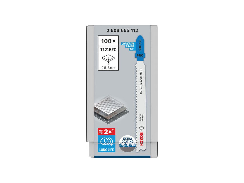 Dlhá životnosť pri rezaní stredne hrubého kovu! Ste obrábač kovov a hľadáte silný a odolný pílový list pre priamočiare píly na rezanie plechov? Vyskúšajte pílový list PRO Metal thick T121BFC. Jeho zuby sme posilnili povlakom, aby lepšie odolávali teplu a oxidácii. To vám umožní robiť viac rovných rezov do stredne hrubého plechu. Pílový list PRO Metal thick T121BFC pre priamočiaru pílu je vyrobený z kombinácie dvoch kovov: má ozubenie z rýchloreznej ocele (HSS) s povlakom z nitridu hliníka a titánu (AlTiN) spojené s telom z uhlíkovej ocele (HCS). Táto kombinácia zaisťuje pevnosť a odolnosť. Geometria zubov – odolné frézované zvlnené zuby – a kónické telo pílového listu a tenký rez zaistia plynulé rezanie. Môžete ho použiť na rezanie stredne hrubého plechu s hrúbkou 2,5 až 6 mm.