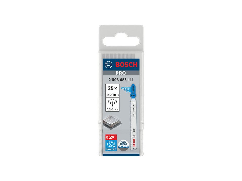 Dlhá životnosť pri rezaní stredne hrubého kovu! Ste obrábač kovov a hľadáte silný a odolný pílový list pre priamočiare píly na rezanie plechov? Vyskúšajte pílový list PRO Metal thick T121BFC. Jeho zuby sme posilnili povlakom, aby lepšie odolávali teplu a oxidácii. To vám umožní robiť viac rovných rezov do stredne hrubého plechu. Pílový list PRO Metal thick T121BFC pre priamočiaru pílu je vyrobený z kombinácie dvoch kovov: má ozubenie z rýchloreznej ocele (HSS) s povlakom z nitridu hliníka a titánu (AlTiN) spojené s telom z uhlíkovej ocele (HCS). Táto kombinácia zaisťuje pevnosť a odolnosť. Geometria zubov – odolné frézované zvlnené zuby – a kónické telo pílového listu a tenký rez zaistia plynulé rezanie. Môžete ho použiť na rezanie stredne hrubého plechu s hrúbkou 2,5 až 6 mm.