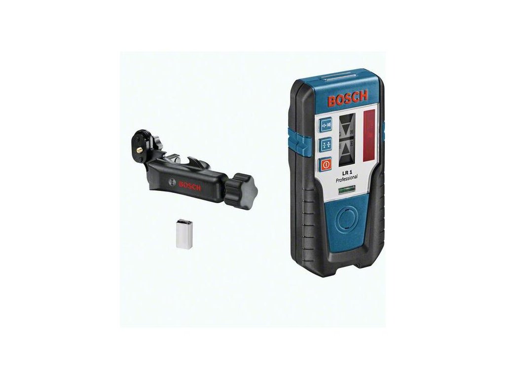 Laserový prijímač LR 1, Väčší úžitok vďaka príslušenstvu, Praktický prijímač do interiérov a exteriérov s dosahom až do 200 m v kombinácii s rotačným laserom GRL 400 H Professional a GRL 300 HV Professional, Optické a akustické vyrovnávanie úrovne s laserovým lúčom, Ochrana proti prachu a striekajúcej vode (IP 65), Držiak (1.608.M00.70F); 1× batéria 9 V (blok) (6LR61)