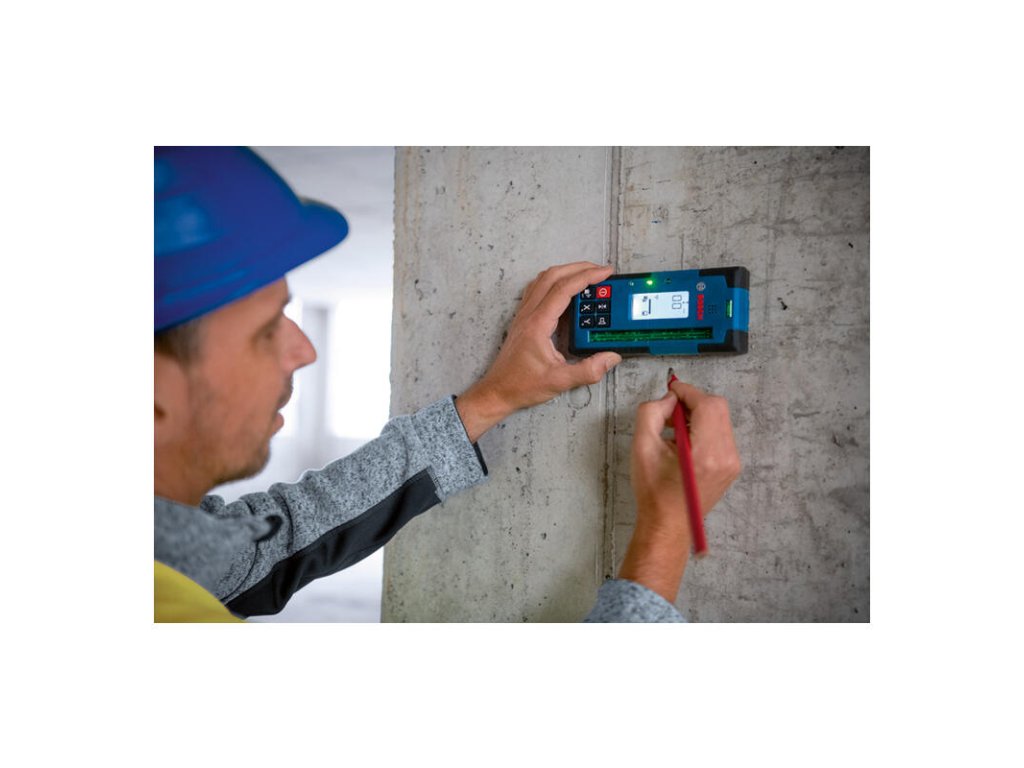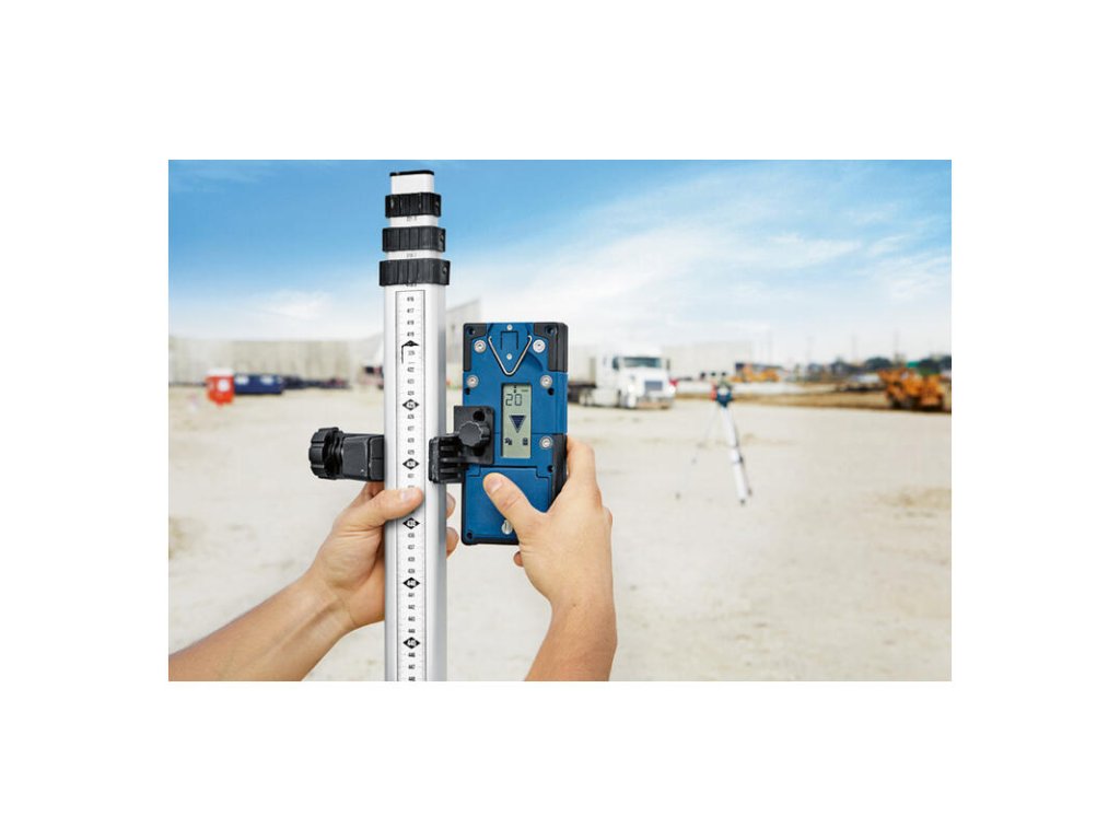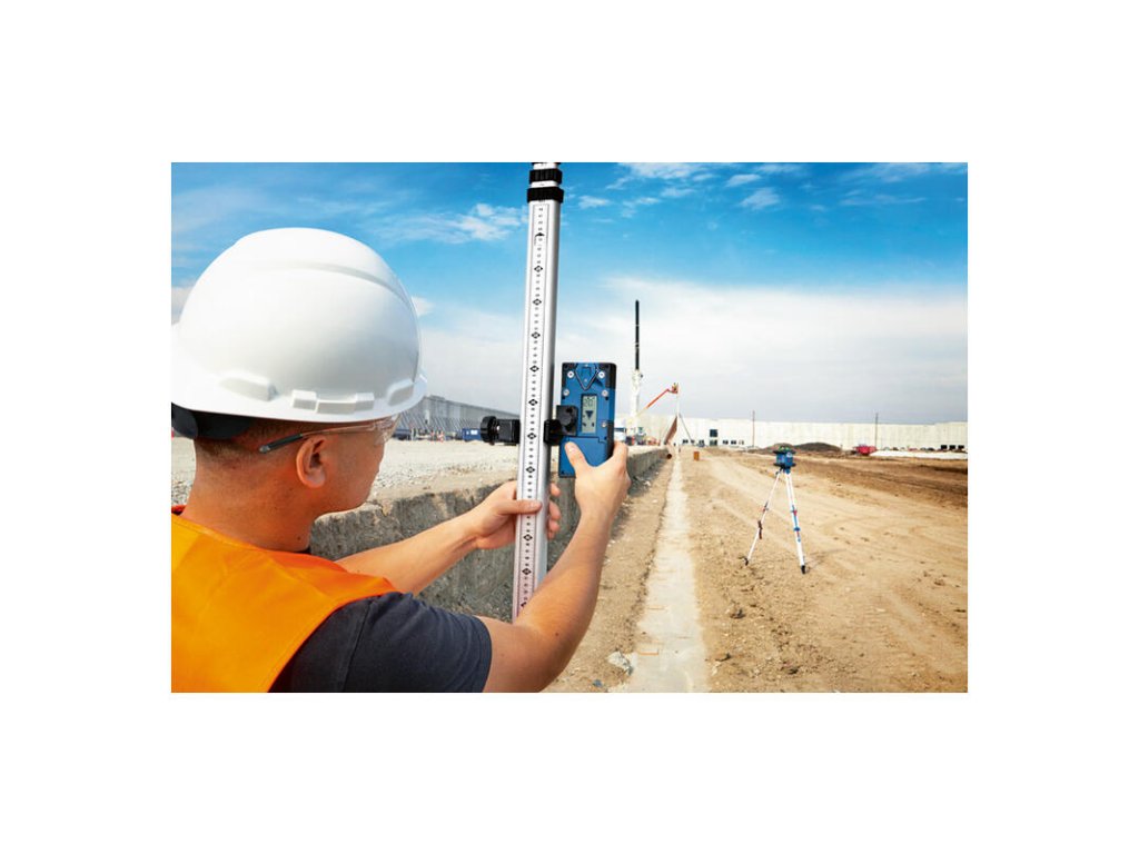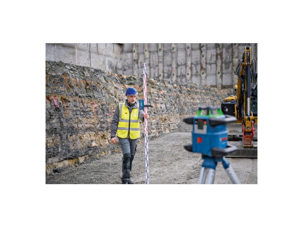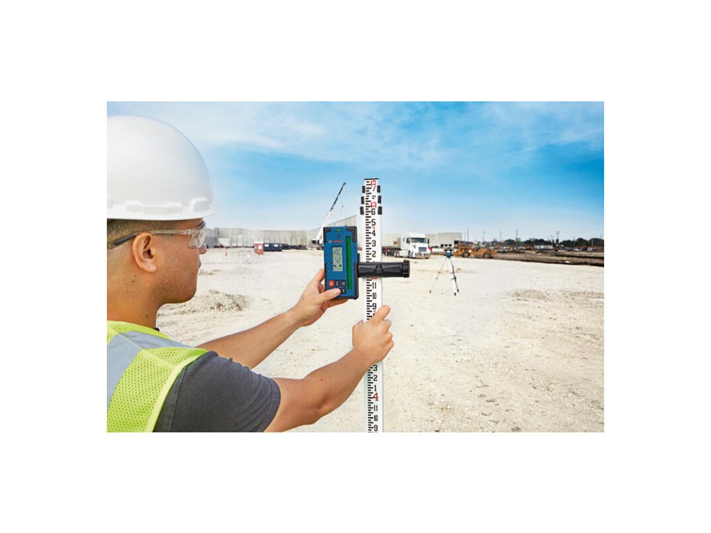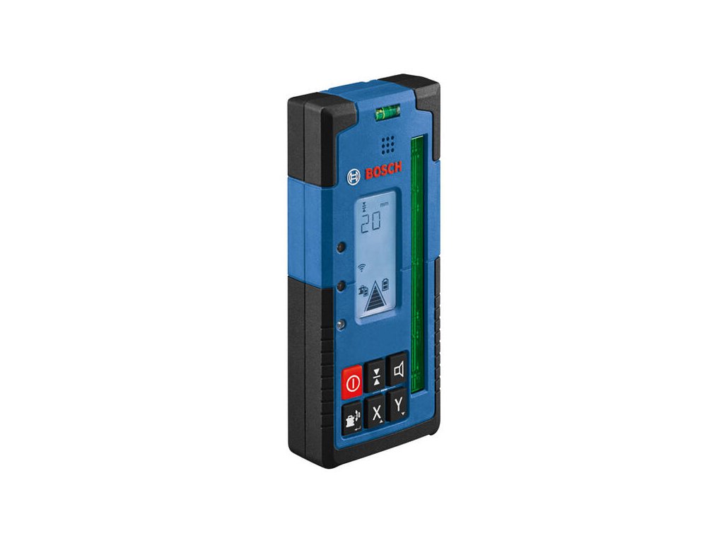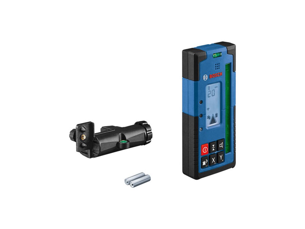 Laserový prijímač LR 65 G, Kompaktný a robustný prístroj LR 65 G Professional je vysokokvalitný laserový prijímač, ktorý rýchlo deteguje zelené laserové lúče. Dlhá recepčná plocha (125 mm) a obojstranný podsvietený displej s funkciou rozdielu v milimetroch zaručujú efektívnu prácu a rýchlu detekciu lasera. Vďaka odolnej gumovej klávesnici, ochrane proti prachu a vode spĺňajúcej normy IP67 a bezpečnej, mäkkej rukoväti je toto náradie vynikajúce na náročné práce. Komunikácia Bluetooth® s rotačným laserom GRL 650 CHVG Professional umožňuje ďalšie funkcie, ako napr. používateľskú kalibráciu (uCAL) a duálne funkcie CenterFind a CenterLock. LR 65 G Professional je ideálny na široký rozsah nivelácie v interiéri a exteriéri a vyrovnávanie. Laserový prijímač ponúka päť nastavení citlivosti a štyri nastavenia hlasitosti a je vybavený indikátormi LED s nastaviteľnou úrovňou jasu na detekciu laserového lúča. Držiak prijímača RB 60 Professional; 2× batéria 1,5 V LR6 (AA)