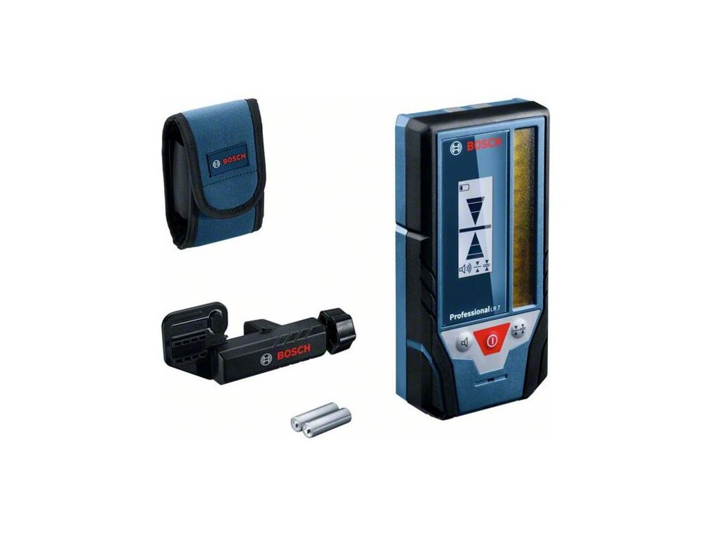 Laserový prijímač LR 7, Schopnosť rozpoznať zelené a červené laserové čiary, Veľké 8 cm prijímacie pole na rýchlu detekciu laserového lúča, Vyrovnávanie úrovne s laserovým lúčom, opticky (na displeji a pomocou LED-diód) a akusticky, na prácu pri rôznych svetelných podmienkach, Držiak na laserový prijímač LR 6/7 (1.608.M00.C1L); Ochranné puzdro; 2× batéria 1,5 V LR6 (AA)