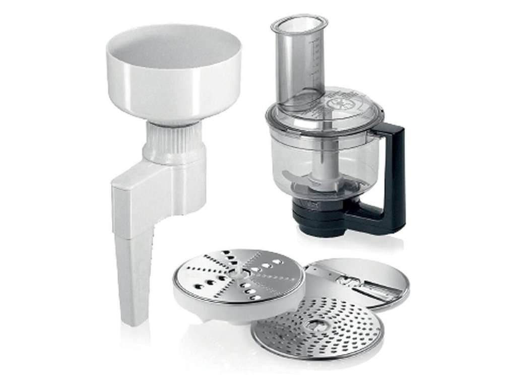 Príslušenstvo BOSCH MUZXLVE1 obsahuje sekací nôž, strúhací kotúč (hrubý a jemný), rezací koutúč (silný a tenký), strúhací kotúč stredne jemný (5 funkcií), mlynček na mak a olejové semená s oceľovými drvičmi. Nechýba nastavenie stupňa mletia od hrubého až po jemné.