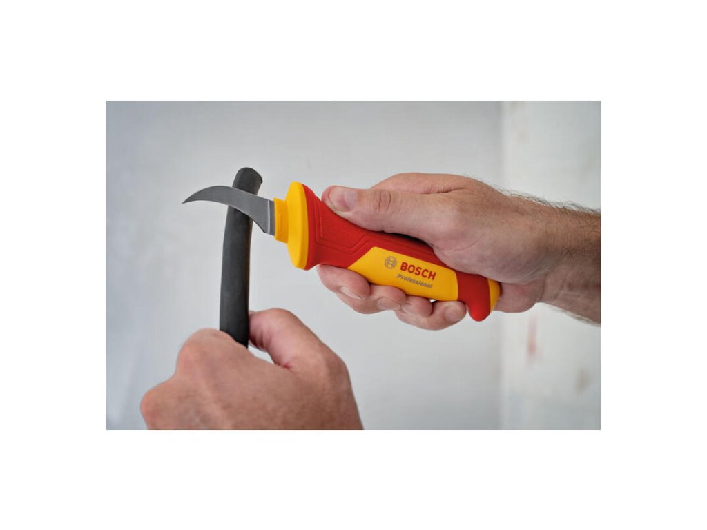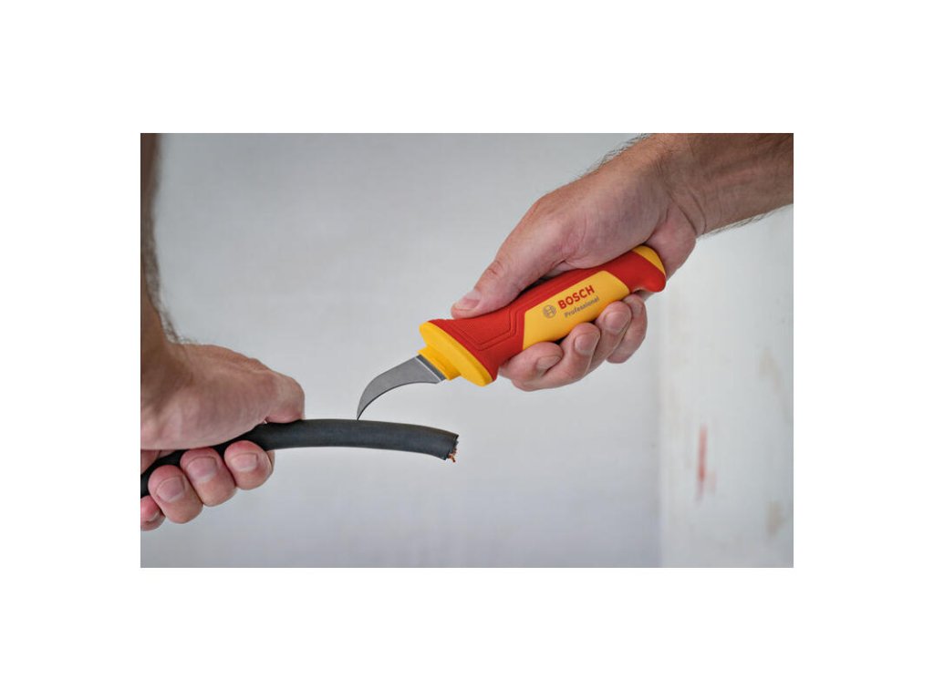 Nôž Odizolovací nôž VDE, Profesionálni remeselníci potrebujú náradie, ktoré sa ľahko používa a spĺňa všetky legislatívne požiadavky. Tento odizolovací nôž VDE Bosch Professional, ktorý spĺňa príslušné normy je izolovaný polypropylénom (PP) a termoplastickým elastomérom (TPE), takže môžete káble môžete odizolovávať, aj keby malo dôjsť k nečakanému kontaktu s komponentmi pod napätím. Toto náradie bolo testované až do 10 000 V a disponuje certifikáciou VDE až do 1 000 V podľa normy DIN EN/IEC 60900. Užívajte si optimálne ovládanie pri práci na elektrických inštaláciách vďaka ergonomickému komfortu s mäkkým úchopom, opierkou na palec a háčikom na prst. Tento rezný nástroj má odolnú oceľovú čepeľ, vďaka čomu je spoľahlivým a odolným spoločníkom profesionálneho remeselníka. Ak toto náradie nepoužívate, nasaďte naň ochranný kryt čepele, aby sa predišlo potenciálnemu zraneniu. Vďaka ručnému náradiu VDE pridanému do nášho radu Bosch Professional získavate náradie spoľahlivej kvality Bosch, ktoré spĺňa vaše požiadavky. Zaneprázdnení elektrikári, inštalatéri alebo údržbári sa presvedčia, že odizolovací nôž VDE s kosákovo tvarovanou čepeľou je ideálnou voľbou na bezpečné odizolovanie káblov a znižuje riziko poškodenia žíl kábla. Kartónová škatuľa