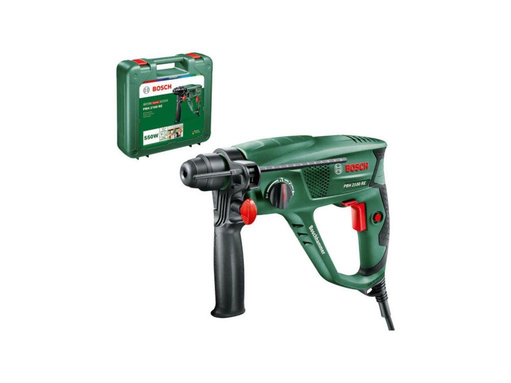 Vŕtacie kladivo PBH 2100 RE; Ľahké a výkonné na vŕtanie, vŕtanie s príklepom a sekanie bez námahy; 550 W motor a pneumatický príklepový mechanizmus s 1,7 J na všeobecné aplikácie; Skľučovadlo SDS plus na rýchlu, bezkľúčovú výmenu príslušenstva; Kladivo a sekáč do betónu a muriva alebo vŕtanie do obkladačiek, dreva a kovu; Funkcia sekania so systémom Vario Lock umožňuje variabilne voliteľnú polohu sekáča; Vŕtanie až do priemeru 20/30/13 mm do betónu/dreva/kovu, hmotnosť len 2,2 kg; Hĺbkový doraz (2.603.001.019); Prídavná rukoväť (2.602.025.102); Kufor