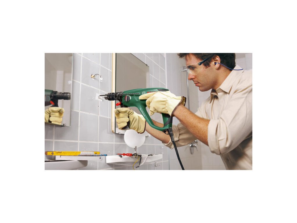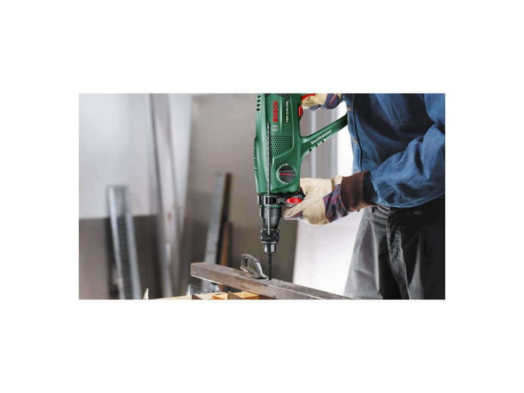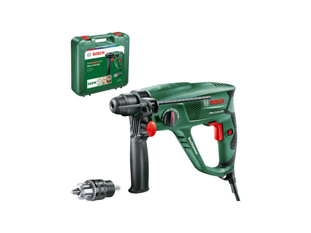 Vŕtacie kladivo PBH 2100 SRE; Ľahké a výkonné na vŕtanie, vŕtanie s príklepom a sekanie bez námahy; 550 W motor a pneumatický príklepový mechanizmus s 1,7 J na všeobecné aplikácie; Skľučovadlo SDS plus na rýchlu, bezkľúčovú výmenu príslušenstva; Kladivo a sekáč do betónu a muriva alebo vŕtanie do obkladačiek, dreva a kovu; Funkcia sekania so systémom Vario Lock umožňuje variabilne voliteľnú polohu sekáča; Vŕtanie až do priemeru 20/30/13 mm do betónu/dreva/kovu, hmotnosť len 2,2 kg; Vŕtacie skľučovadlo SDS plus; Hĺbkový doraz (2.603.001.019); Prídavná rukoväť (2.602.025.102); Kufor
