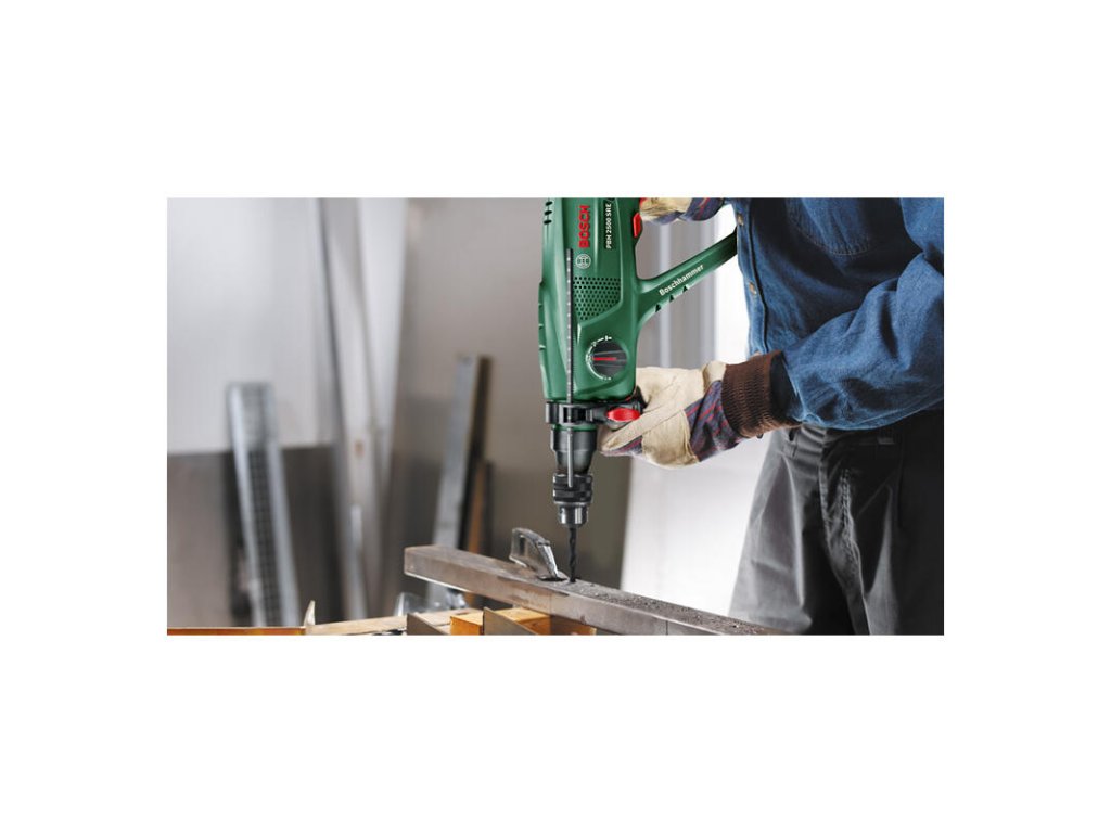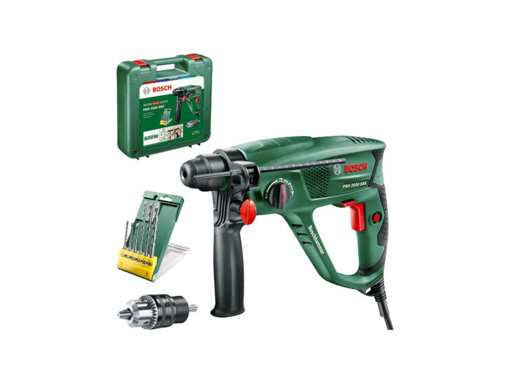 Vŕtacie kladivo PBH 2500 SRE; Veľmi výkonné a kompaktné na vŕtanie, vŕtanie s príklepom a sekanie; Motor s príkonom 600 W a pneumatický príklepový mechanizmus 1,9 J na akékoľvek práce; Skľučovadlo SDS plus ne výmenu nástrojov bez náradia a skľučovadlo na vŕtací SDS adaptér pre stopkové vrtáky; Vŕtanie s príklepom a sekanie do betónu a muriva, vŕtanie do obkladačiek, dreva a kovu; Funkcia sekania so systémom Vario Lock ponúka variabilne voliteľnú polohu sekáča; Nízka hmotnosť (2,2 kg); vŕtanie až do priemeru 20/30/13 mm do betónu/dreva/kovu; Vŕtacie skľučovadlo SDS plus; 6-dielna súprava vrtákov SDS plus S2 (2.607.019.447); Hĺbkový doraz (2.603.001.019); Prídavná rukoväť (2.602.025.102); Kufor