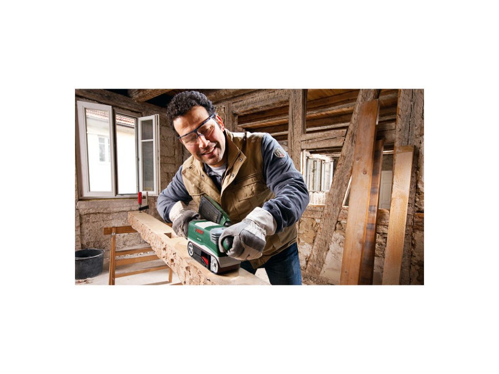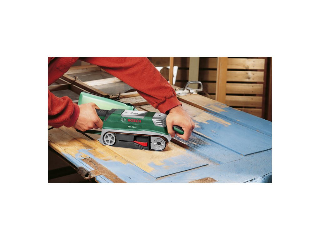 Pásová brúska PBS 75 AE; Vysoko účinné, komfortné brúsenie s reguláciou otáčok; Účinné brúsenie – veľmi výkonný 750 W motor umožňuje vysoký úber materiálu; Univerzálnosť – elektronická predvoľba otáčok pre perfektné otáčky pre každý materiál; Ovládateľnosť – kompaktná s odpojiteľnou prídavnou rukoväťou na optimálne ovládanie; Pohodlná – automatické nastavovanie pásu udržuje pás vycentrovaný počas prevádzky; Ideálna na brúsenie väčších plochých povrchov na rôznych materiáloch, od dreva po kovy; 1 brúsny pás K 80; Kufor