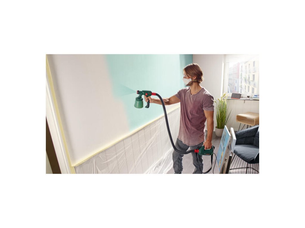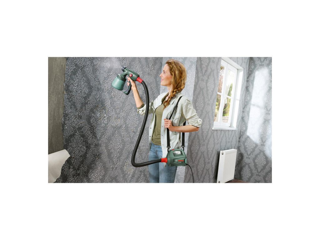 Systém na rozprašovanie farby PFS 2000; Zbohom štetky – rýchle a rovnomerné nanášanie na textúrované povrchy a rohy; Kompaktná, ľahká konštrukcia a 440 W motor robia maľovanie veľmi rýchlym a ľahkým; Nanáša farbu rovnomerne s rýchlosťou 1,5 m²/min, vhodný je na malé až stredné projekty v interiéroch a exteriéroch; Dva 800 ml zásobníky farby šetria drahocenný čas minimalizáciou dopĺňania počas práce; Striekací systém ALLPaint: nanášanie farby na drevo, glazúru alebo lak na drevo alebo kov; Začnite hneď s prácou na projekte, pomôžu vám názorné ikony na zariadení; Dýzy na lakové farby a lazúry (sivá); Dýzy na farbu na steny (biela); Popruh; Kombinácia lievika a filtra na farbu; 800 ml nádobka s vekom (1.600.Z00.00K); V škatuli