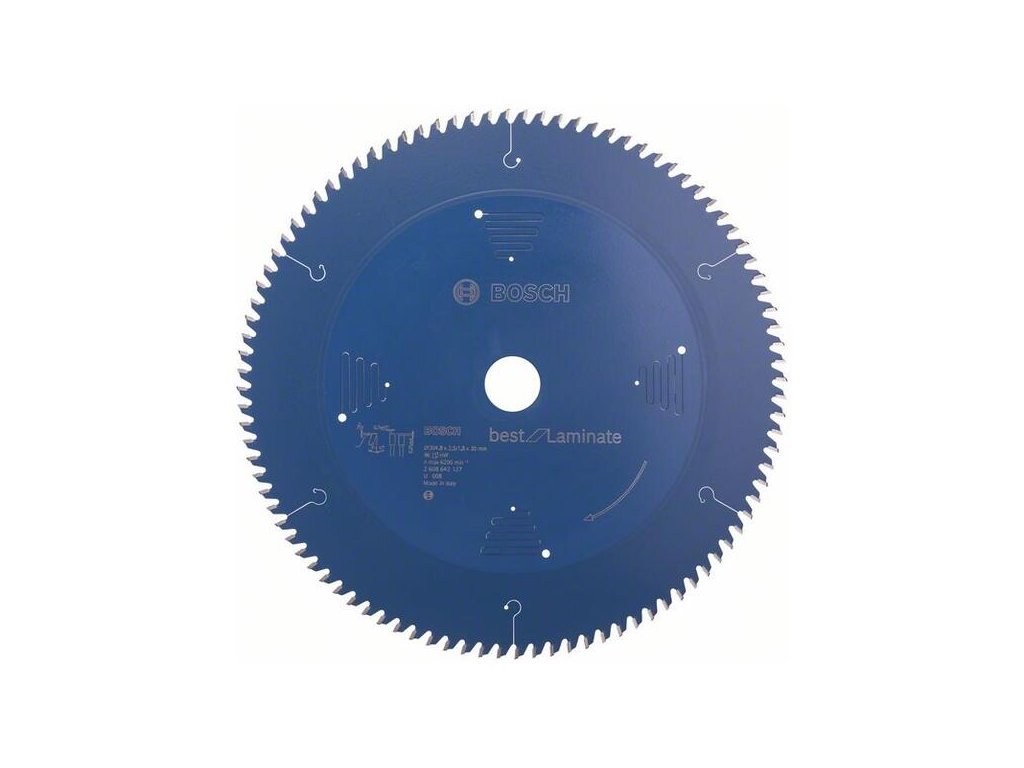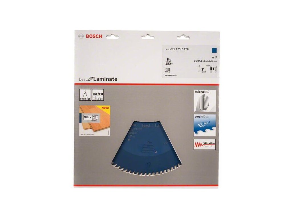Pílový kotúč Best for Laminate má dobrú odolnosť pri rezaní všetkých typov laminátových podláh. Ochranný povlak kotúča Proteqtion zabraňuje korózií a umožňuje spoľahlivé rezanie pri zníženom trení. Tento povlak navyše udržiava kotúč studený, čím ho chráni pred koróziou. Jeho vysoký výkon a kvalitu tiež posilňujú jedinečné, mimoriadne tvrdé zuby Microteq, ktoré vyrába priamo firma Bosch a ktoré obsahujú odolné karbidové zrná. Okrem toho má kotúč špeciálne navrhnuté protivibračné drážky, ktoré podstatne znižujú vibrácie a hlučnosť na zvýšenie jednoduchosti a pohodlnosti presného rezania. Pílový kotúč The Best for Laminate má zuby HLTCG (High-Low Triple Chip Ground), vďaka ktorým je dostatočne pevný aj na prácu s veľmi abrazívnymi materiálmi, ako sú laminátové podlahy.