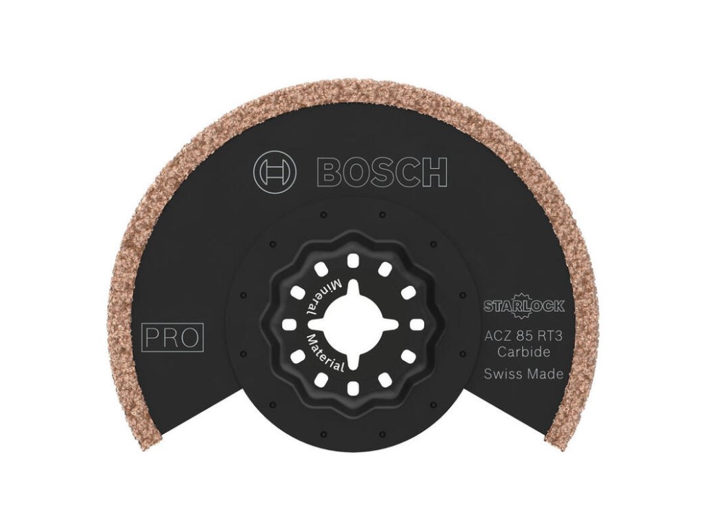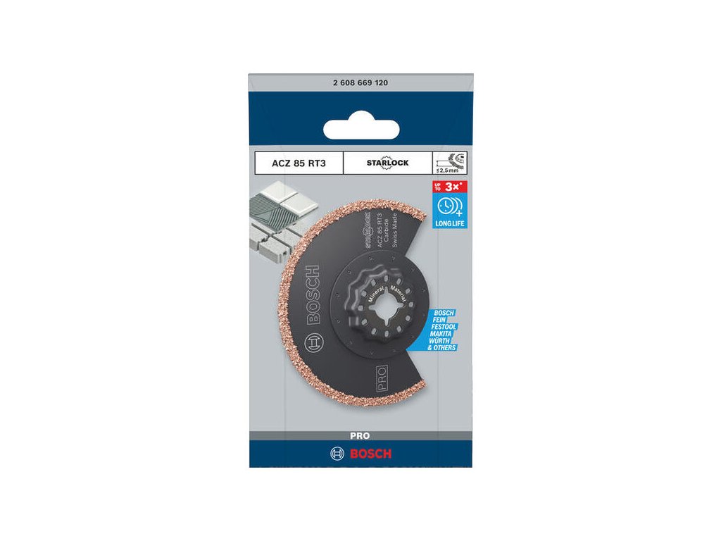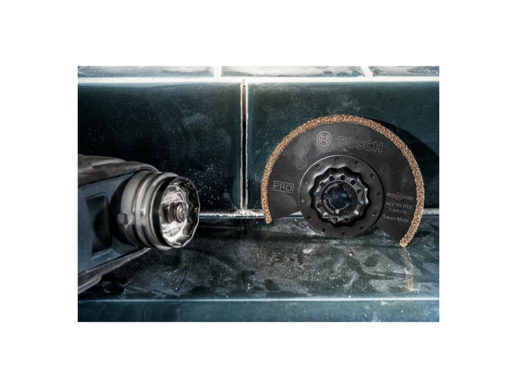 Odstraňovanie škárovacej hmoty s dlhou životnosťou! Viacúčelové náradie je dokonale vhodné na odstraňovanie starej škárovacej hmoty bez poškodenia dlaždíc. PRO ACZ 85 RT3 túto práci to robí efektívne a súčasne ponúka dlhú životnosť. Môžete ho použiť aj na rezanie káblových kanálov do pórobetónu. Pílový list PRO ACZ 85 RT3 Grout Segment Blade využíva tvrdé karbidové zrná, čo mu dodáva odolnosť a účinnosť pri práci s abrazívnymi materiálmi.