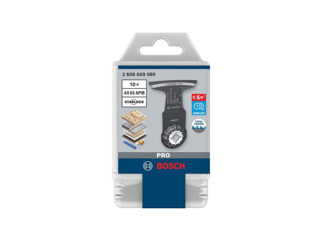 Rezanie dreva, mäkkých kovov a plastov s dlhou životnosťou! Profesionáli, ktorí oceňujú schopnosť viacúčelového náradia vykonávať rezy so zapichnutím, zarovnávacie rezy a presné výrezy, potrebujú aj všestranný pílový list, ktorý vyniká v týchto úlohách: PRO AII 65 APIB má nielen mimoriadne schopnosti pri spracovávaní rôznych materiálov, ale ponúka aj vynikajúcu životnosť. Pílový list PRO AII 65 APIB Plunge Cut Blade je vyrobený z kombinácie dvoch kovov, čo mu dodáva pevnosť a odolnosť. Jeho zuby majú povrchovú úpravu, ktorá im dodáva ešte vyššiu odolnosť. Vďaka vyhotoveniu Curved-Tec je pílový list ideálny na rezy so zanorením bez trhania.