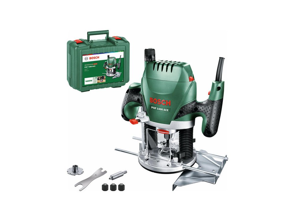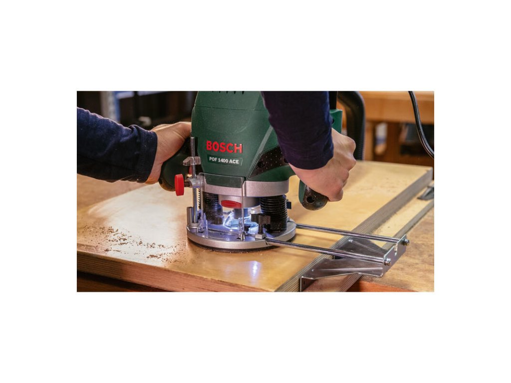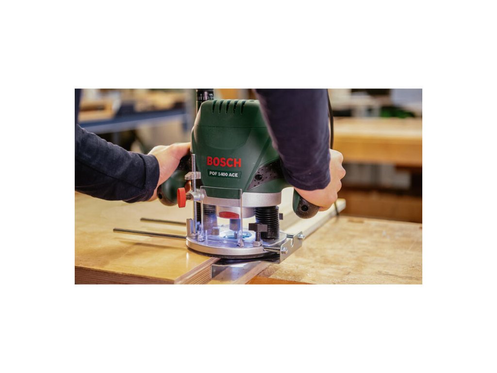 Horná fréza POF 1400 ACE; Pre vysoko kvalitné vrúbkovanie pri náročných projektoch; Konštantná elektronika Bosch na dosiahnutie vynikajúcich výsledkov napriek zaťaženiu; Nastaviteľná hĺbka frézovania s pozoruhodnou presnosťou do 1/10 mm; Power Light na sledovanie línie rezu a vysávač na čistenie línie rezu; Paralelný doraz ponúka asistenciu pri frézovaní precíznych priamych drážok a kruhov; Vkladanie kopírovacej objímky bez nástrojov vďaka systému SDS; Odsávací adaptér (2.600.499.077); Vidlicový kľúč (1.609.203.V40); Drážkovacia fréza (Ø 8 mm) (2.608.628.381); Paralelný doraz (1.609.203.M85); Vystreďovací kolík (2.609.200.310); 3 upínacie klieštiny (6 mm, 8 mm a 1/4"); Kopírovacia objímka (katalógové číslo: 1.609.203.V39); Kufor z plastu (2.605.438.643)