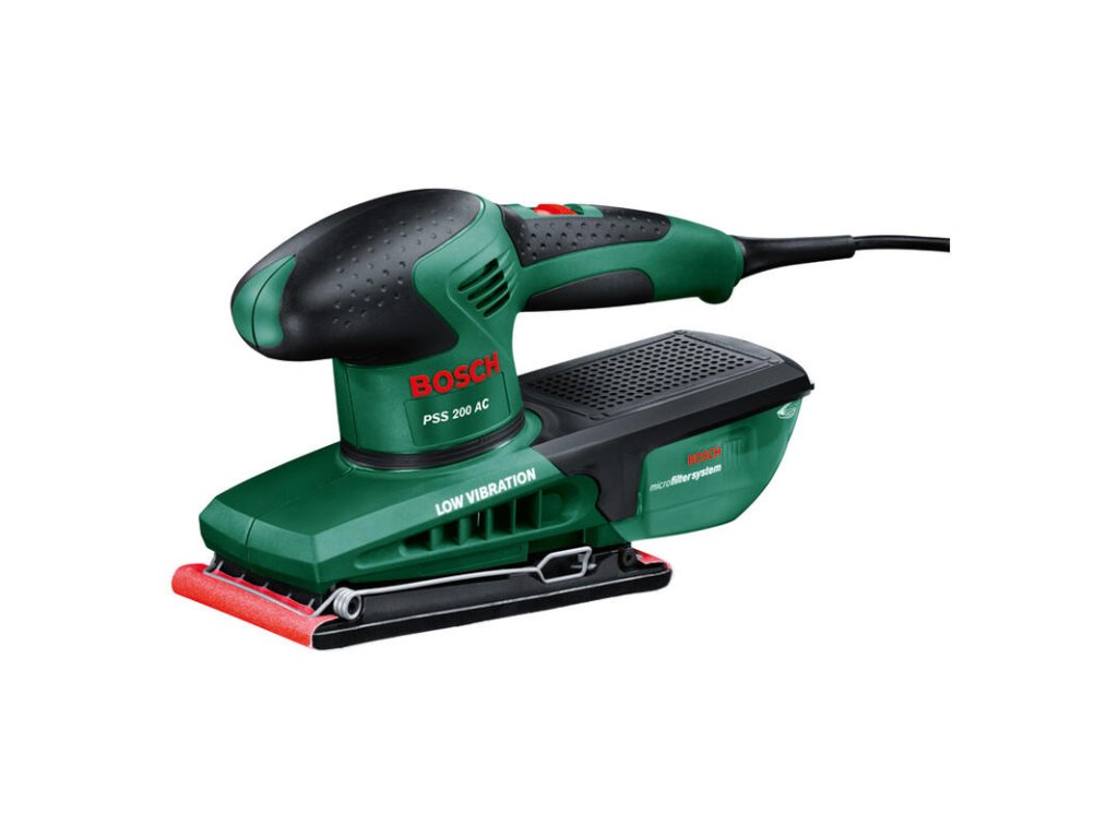 Vibračná brúska PSS 200 AC; Najvyššia kvalita povrchu na veľkých plochách; Ideálne riešenie pre najjemnejší výbrus a rýchly postup brúsenia s výkonným motorom s príkonom 200 W a brúsnou plochou 92x182 mm; Čistá práca vďaka mikrofiltračnému systému Bosch: zabudovaný prvok na odsávanie prachu odsáva prach priamo do dodanej schránky s mikrofiltrom; Upínacie brúsnych listov upínacou páčkou pre jednoduchú a pohodlnú výmenu brúsnych papierov; Nátrubok na pripojenie odsávania; Mäkká rukoväť zaručuje príjemnú prácu; Pohodlná manipulácia i pri používaní ľavákmi; Brúsny list (Red Wood) P120; Mikrofilter Bosch; Kufor z plastu