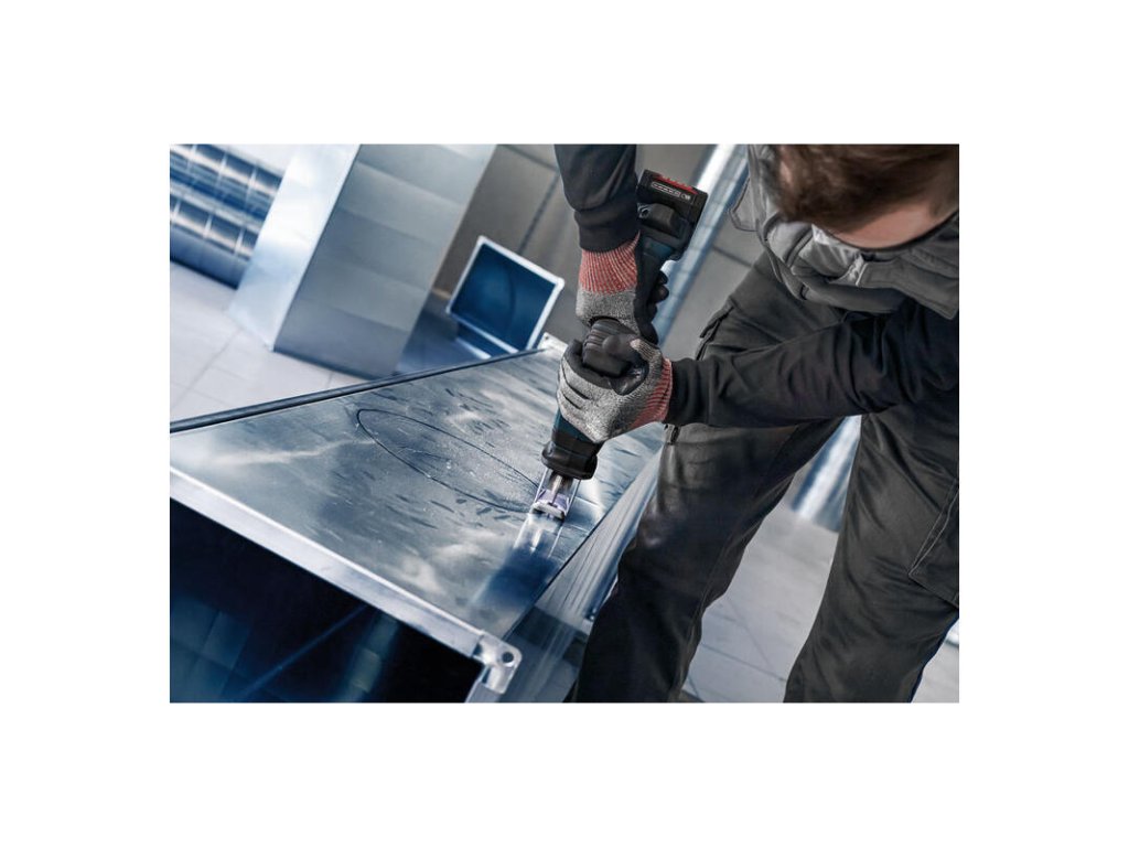 - Jedinečný hrot je navrhnutý tak, aby sa zanáral priamo do plechu ako bajonet – pred zapnutím píly – a potom vďaka veľmi jemným zubom hladko rezal.