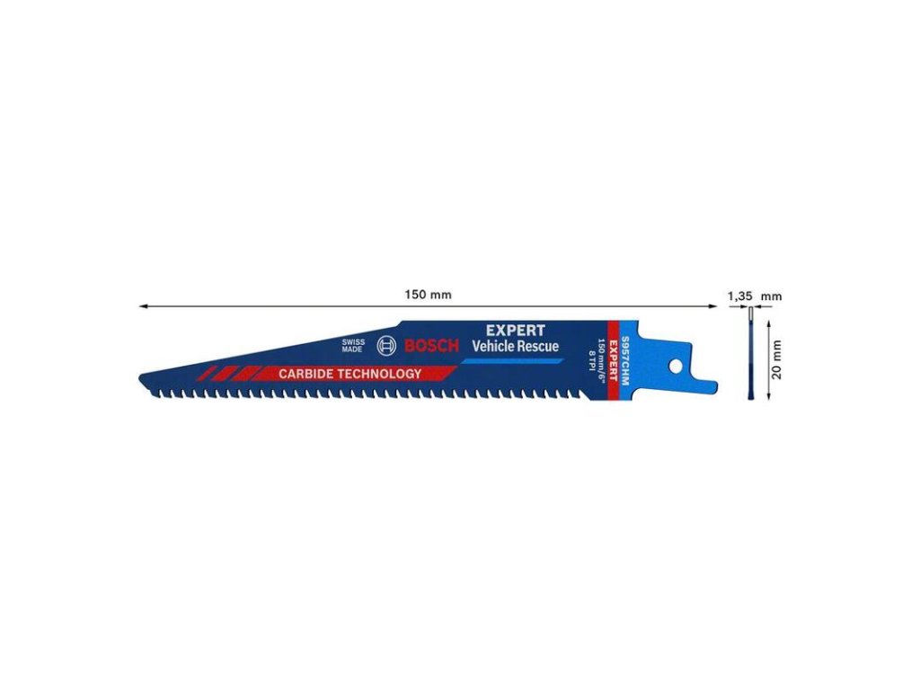 - Pílový list Bosch EXPERT Vehicle Rescue pre chvostové píly je vyrobený pomocou Bosch Carbide Technology, takže reže moderné vozidlá rýchlo a spoľahlivo a pomáha vám zachraňovať životy.
