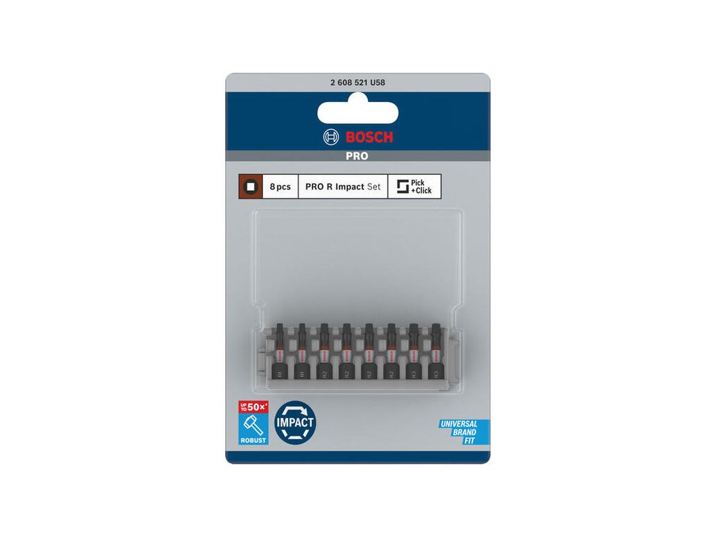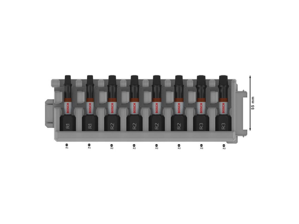 Komplexná sada pre prácu so štvorhrannými skrutkami. Obsahuje najčastejšie používané veľkosti R1, R2 a R3, pričom najfrekventovanejšia veľkosť R2 je zastúpená štyrikrát. Bity sú optimalizované pre rázové uťahovače a ponúkajú extrémnu odolnosť.