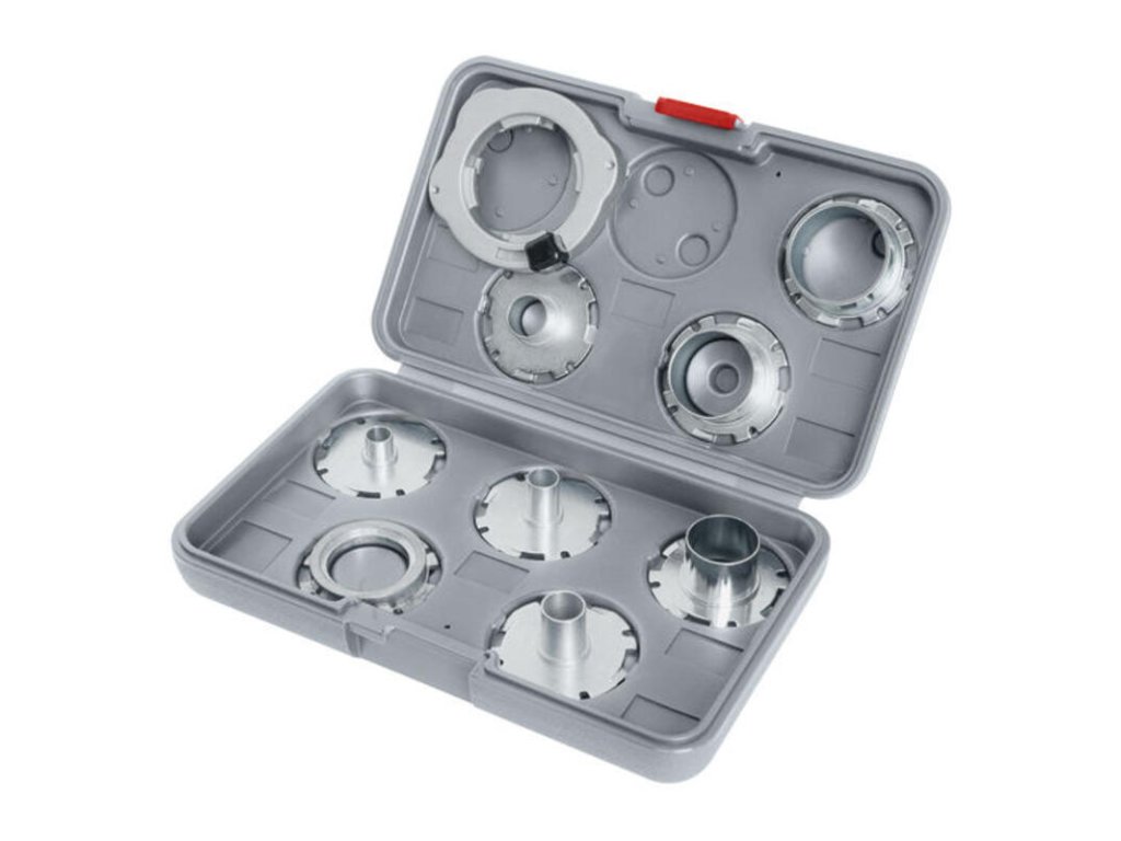Rozšírte možnosti svojej frézky GKF 18V-8. Táto sada obsahuje 9 metrických kopírovacích krúžkov pre prácu s rôznymi šablónami. Systém rýchlej výmeny umožňuje meniť puzdrá okamžite. Nevyhnutnosť pre výrobu nábytku a sériové frézovanie tvarov.