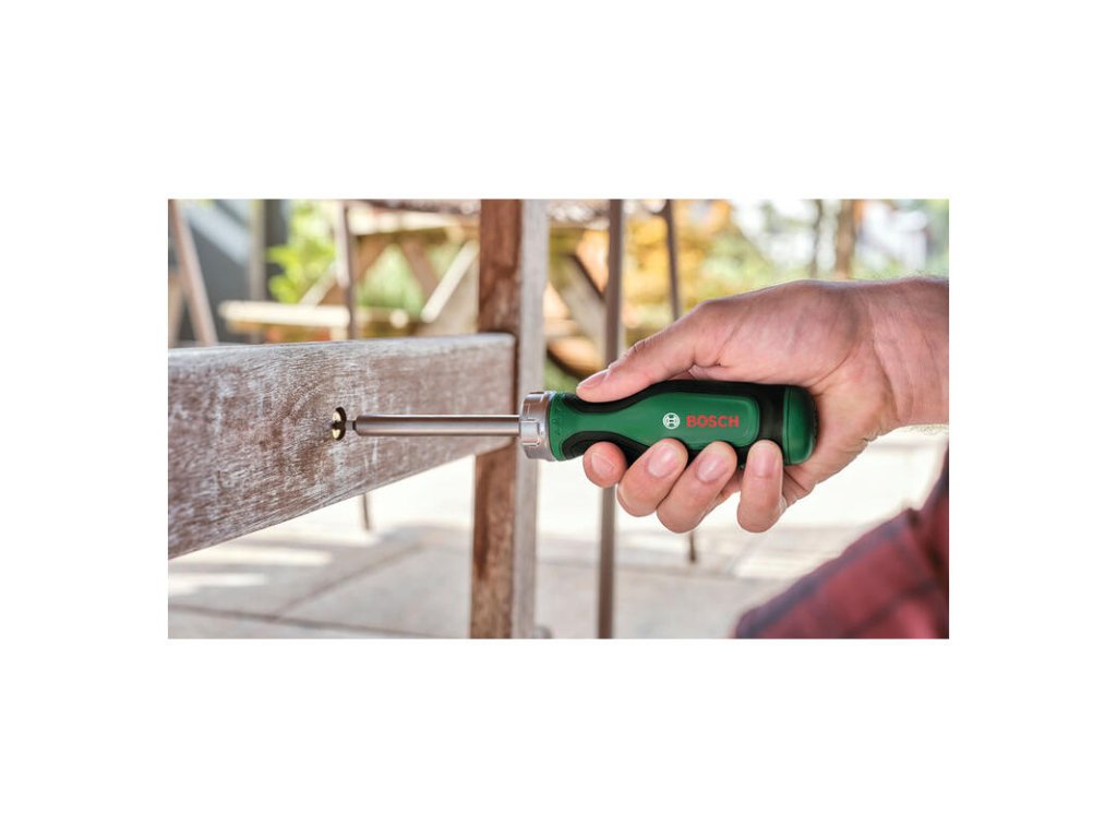 Ručné náradie Skrutkovač s račňou a 12 bitmi; Skrutkovač s račňou s vysokým krútiacim momentom na efektívne skrutkovanie; Račňová funkcia s mechanizmom s 36 zubami a krútiacim momentom až 50 Nm; Stabilné skrutkovanie vďaka drieku dĺžky 80 mm a magnetickému držiaku skrutkovacích hrotov; Ergonomická konštrukcia a mäkká rukoväť na plné ovládanie a optimálnu silu; Intuitívny kovový prstenec s ľavou a pravou polohou a manuálnym stredovým nastavením; Vysúvací zásobník na skrutkovacie hroty s 12 farebne rozlíšenými hrotmi z ocele S2 rozmanitých veľkostí; 12 skrutkovacích hrotov Standard; V škatuli