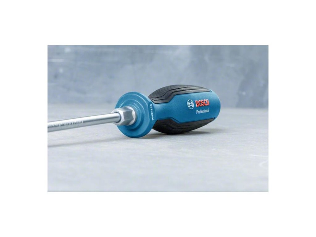 Skrutkovač Skrutkovač SL5,5, Skrutkovač Bosch SL5.5 Professional je mimoriadne odolný vďaka priebežnému kovovému drieku, ktorý prechádza cez rukoväť, kovovému vystuženému koncu rukoväte a tvrdenému hrotu. Ergonomický tvar a mäkká rukoväť zabezpečujú pohodlné používanie a integrovaný šesťhranný skrutkovač umožňuje dosiahnuť výnimočný krútiaci moment. Ideálny na skrutkovanie, sekanie a uvoľňovanie pevných skrutiek. Veľkosti sú uvedené na rukoväti, takže môžete rýchlo nájsť správny skrutkovač na prácu. Dĺžka hriadeľa 125 mm. Ďalšie dostupné veľkosti: SL 6,5 × 125 mm a 4,5 × 100 mm.