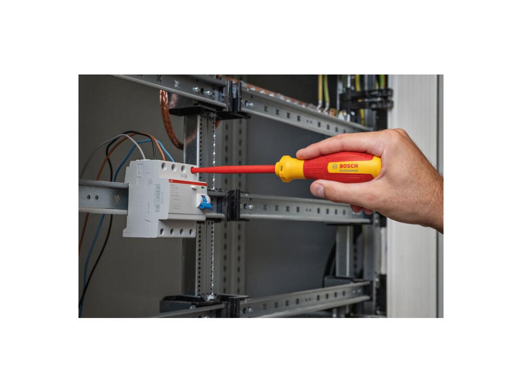 Skrutkovač Skrutkovač VDE PH1 × 100, Profesionálni remeselníci potrebujú náradie, ktoré sa ľahko používa a spĺňa všetky legislatívne požiadavky. Skrutkovač Bosch Professional VDE PH1 × 100 umožňuje uťahovanie a uvoľňovanie skrutiek, a to aj keď dôjde k nečakanému kontaktu s komponentmi pod napätím. Toto náradie spĺňajúce požiadavky noriem je izolované termoplastickým elastomérom (TPE). Toto náradie bolo testované až do 10 000 V a disponuje certifikáciou VDE až do 1 000 V podľa normy DIN EN/IEC 60900. Náš skrutkovač VDE je presný a odolný; jeho štíhly driek a odolný hrot zaručujú presnú montáž. Mäkký úchop a vynikajúca ergonomická konštrukcia poskytujú komfort ruke používateľa a umožňujú komfortnú pácu. Driek skrutkovača z ocele S2 má izolovaný ochranný povlak a rukoväť je izolovaná TPE. Vďaka ručnému náradiu VDE pridanému do nášho radu Bosch Professional získavate náradie spoľahlivej kvality Bosch, ktoré spĺňa vaše požiadavky. Skrutkovače Bosch Professional VDE majú antirolovaciu konštrukciu, ktorá zabraňuje, aby sa odkotúľali z miesta práce. Navyše profil a veľkosť sú zreteľné viditeľné na viacerých pozíciách na rukoväti. Hang Tag