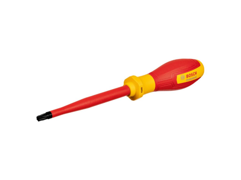 Skrutkovač Skrutkovač VDE TX40 × 125, Profesionálni remeselníci potrebujú náradie, ktoré sa ľahko používa a spĺňa všetky legislatívne požiadavky. Skrutkovač Bosch Professional VDE TX40 × 125 umožňuje uťahovanie a uvoľňovanie skrutiek, a to aj keď dôjde k nečakanému kontaktu s komponentmi pod napätím. Toto náradie spĺňajúce požiadavky noriem je izolované termoplastickým elastomérom (TPE). Toto náradie bolo testované až do 10 000 V a disponuje certifikáciou VDE až do 1 000 V podľa normy DIN EN/IEC 60900. Náš skrutkovač VDE je presný a odolný; jeho štíhly driek a odolný hrot zaručujú presnú montáž. Mäkký úchop a vynikajúca ergonomická konštrukcia poskytujú komfort ruke používateľa a umožňujú komfortnú pácu. Driek skrutkovača z ocele S2 má izolovaný ochranný povlak a rukoväť je izolovaná TPE. Vďaka ručnému náradiu VDE pridanému do nášho radu Bosch Professional získavate náradie spoľahlivej kvality Bosch, ktoré spĺňa vaše požiadavky. Skrutkovače Bosch Professional VDE majú antirolovaciu konštrukciu, ktorá zabraňuje, aby sa odkotúľali z miesta práce. Navyše profil a veľkosť sú zreteľné viditeľné na viacerých pozíciách na rukoväti. Hang Tag