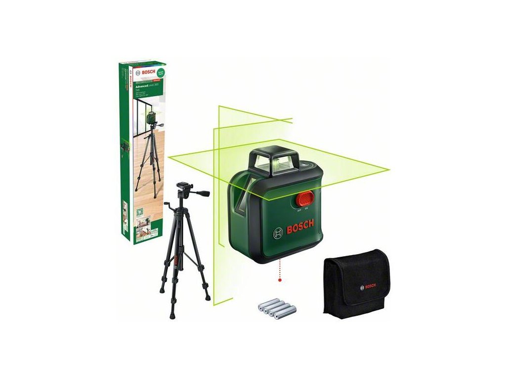Krížový čiarový laser Súprava AdvancedLevel 360; Všestranné na presné zarovnávanie; Premietanie 360° vodorovnej čiary, 2 zvislých línií a spodného nulového bodu; Všetky odkazy na rýchle a jednod. zarovnávanie, vytyčovanie kolmíc a prenos; Technológia zeleného lasera: 4-krát lepšia viditeľnosť aj pri silnom osvetlení; Presnosť ±0,4 mm/m na presné pracovné výsledky; Uhol apertúry 120° na dlhé laserové línie aj na krátke pracovné vzdialenosti; Náradie podporuje trvalú udržateľnosť, viac podrobností nájdete nižšie; 4 batérie 1,5 V LR6 (AA); Statív TT 150 (0.603.691.101); Mäkký vak; V škatuli