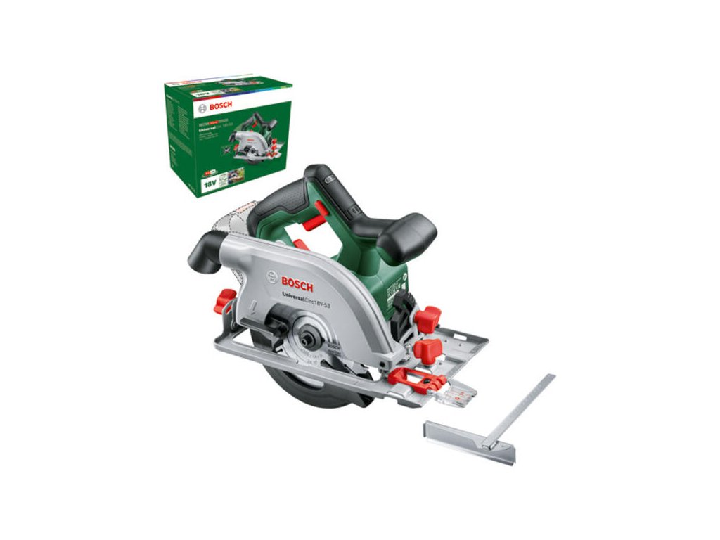 Akumulátorová okružná píla UniversalCirc 18V-53; Výkonná okružná píla na presné priame rezy, najlepšia vo svojej triede; Zvládne väčšinu práce s drevom v kategórii DIY vďaka kapacite rezu 53 mm; Prémiový pílový kotúč Optiline 160 mm s karbidovými zubami na presné rezanie; Kompatibilný systém vodiacej lišty Bosch Home & Garden na presné rovné a skosené rezy; Pozoruhodná kapacita rezu 33 m na nabitie akumulátora 2,5 Ah (drevotriesková doska 19 mm ); Ideálne na výstavbu terás alebo výrobu drevotrieskových políc; Pripojenie na vysávač na odstránenie viac než 90 % prachu; Kompatibilné s akumulátorom Bosch 18V POWER FOR ALL; Pílový kotúč do okružnej píly Optiline Wood (2.608.641.171); Odsávací adaptér (1.609.203.X86); Paralelný doraz (2.608.005.018); Kartónová škatuľa