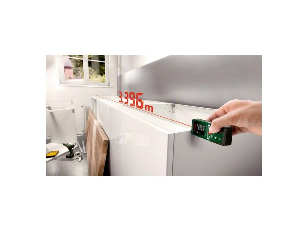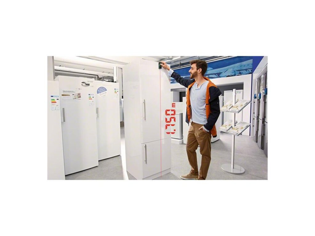 Digitálny laserový merač vzdialeností UniversalDistance 50; Ľahké a presné meranie až do vzdialenosti 50 m – so všetkými dôležitými funkciami; Presné laserové meranie vzdialenosti až do 50 m; Integrované funkcie na jednoduché meranie dĺžok, plôch a objemov; Ideálny prístroj na výpočet štvorcových metrov pri určovaní potrebného množstva tapety alebo farby; Funkcie zahŕňajú pripočítanie/odpočítanie, ako aj min./max. merania a úložný priestor na 10 údajov; Vysokokvalitný farebný displej zaručuje optimálnu čitateľnosť; Náradie podporuje trvalú udržateľnosť, viac podrobností nájdete nižšie; 2 batérie 1,5 V LR03 (AAA); Mäkký vak; V škatuli
