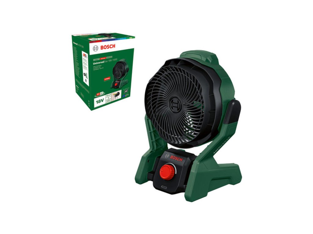 Akumulátorový ventilátor UniversalFan 18V-1000; Úplne nový akumulátorový ventilátor: chladenie s vynikajúcim výkonom a všestrannosťou; Silné prúdenie vzduchu, dlhý čas prevádzky a nízka hladina hluku vďaka technológii prúdenia vzduchu Bosch JetBreeze; Nastaviteľná hlava ventilátora a rozličné možnosti zavesenia a umiestnenia ponúkajú maximálnu všestrannosť; Nízka hmotnosť, kompaktné rozmery a odolná konštrukcia pre domácich majstrov; Vyrobené v EÚ použitím 80 % recyklovaných materiálov v plášti produktu; Technológia Syneon na optimálny výkon alebo maximálnu výdrž podľa potreby; Kompatibilné s akumulátorom Bosch 18V POWER FOR ALL; Kartónová škatuľa