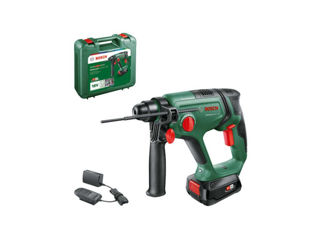 Akumulátorové vŕtacie kladivo UniversalHammer 18V; Multifunkčné akumulátorové náradie: vŕtanie, príklepové vŕtanie, sekanie a skrutkovanie; Kompaktná, praktická konštrukcia ponúka pozoruhodný výkon náradia typu 4 v 1; Pneumatický príklepový mechanizmus 2,0 J na vŕtanie až do ∅ 16 mm a sekanie do betónu; Univerzálne vŕtacie skľučovadlo SDS plus na ľahkú výmenu vrtákov a sekáčov bez námahy; Ovládanie vibrácií a otáčok zaručuje bezpečnejšiu manipuláciu a menšiu námahu; Kompatibilné s akumulátorom Bosch 18V POWER FOR ALL; 1 akumulátor PBA 18V 2.5Ah; Nabíjačka AL 18V-20; Hĺbkový doraz; Prídavná rukoväť; Kufor