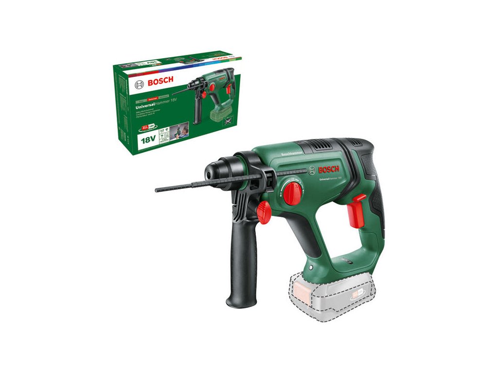 Akumulátorové vŕtacie kladivo UniversalHammer 18V; Multifunkčné akumulátorové náradie: vŕtanie, príklepové vŕtanie, sekanie a skrutkovanie; Kompaktná, praktická konštrukcia ponúka pozoruhodný výkon náradia typu 4 v 1; Pneumatický príklepový mechanizmus 2,0 J na vŕtanie až do ∅ 16 mm a sekanie do betónu; Univerzálne vŕtacie skľučovadlo SDS plus na ľahkú výmenu vrtákov a sekáčov bez námahy; Ovládanie vibrácií a otáčok zaručuje bezpečnejšiu manipuláciu a menšiu námahu; Kompatibilné s akumulátorom Bosch 18V POWER FOR ALL; Hĺbkový doraz; Prídavná rukoväť; V škatuli